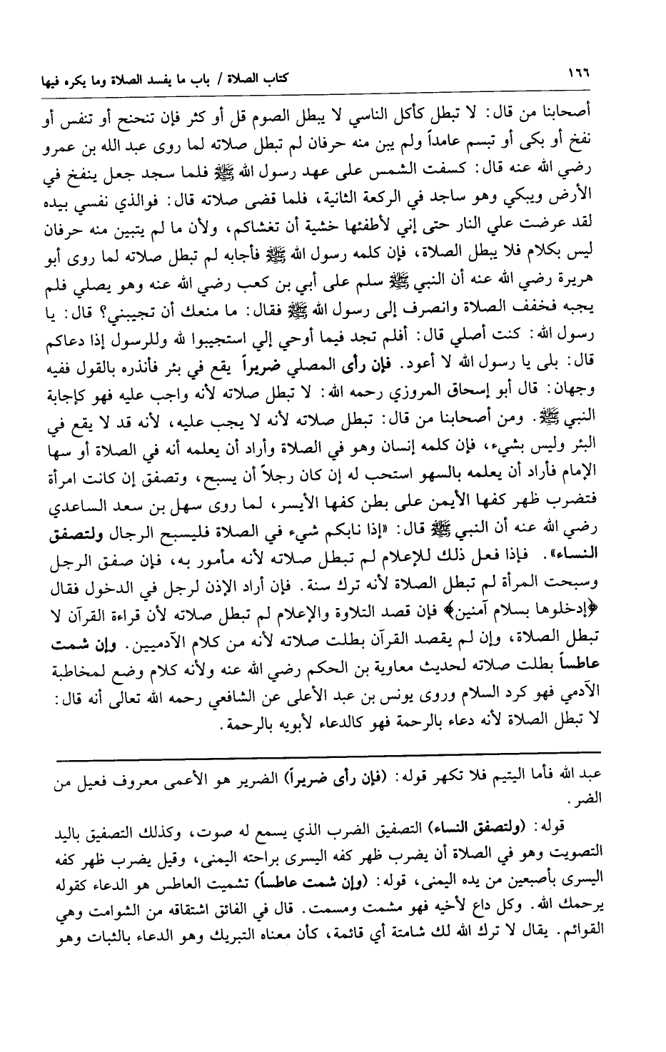 أصحابنا من قال: لا تبطل كأكل الناسي لا يبطل الصوم قل أو كثر فإن تنحنح أو تنفس أو نفخ أو بكى أو تبسم عامداً ولم يبن منه حرفان لم تبطل صلاته لما روى عبد الله بن عمرو رضي الله عنه قال: كسفت الشمس على عهد رسول الله صلى الله عليه وسلم فلما سجد جعل ينفخ في الأرض ويبكي وهو ساجد في الركعة الثانية فلما قضى صلاته قال: فوالذي نفسي بيده لقد عرض على النار حتى إني لأطفئها خشية أن تغشاكم ولأن ما لم يتبين منه حرفان ليس بكلام فلا يبطل الصلاة فإن كلمه رسول الله صلى الله عليه وسلم فأجابه لم تبطل صلاته لما روى أبو هريرة رضي الله عنه أن النبي صلى الله عليه وسلم سلم على أبي بن كعب رضي الله عنه وهو يصلي فلم يجبه فخفف الصلاة وانصرف إلى رسول الله صلى الله عليه وسلم فقال: ما منعك أن تجيبني؟ قال: يا رسول الله: كنت أصلي قال: أفلم تجد فيما أوحي إلي استجيبوا لله وللرسول إذا دعاكم قال: بلى يا رسول الله لا أعود فإن رأى المصلي ضريراً يقع في بئر فأنذره بالقول ففيه وجهان: قال أبو إسحاق المروزي رحمه الله: لا تبطل صلاته لأنه واجب عليه فهو كإجابة النبي صلى الله عليه وسلم ومن أصحابنا من قال: تبطل صلاته لأنه لا يجب عليه لأنه قد لا يقع في البئر وليس بشيء فإن كلمه إنسان وهو في الصلاة وأراد أن يعلمه أنه في الصلاة أو سها الإمام فأراد أن يعلمه بالسهو استحب له إن كان رجلاً أن يسبح وتصفق إن كانت امرأة فتضرب ظهر كفها الأيمن على بطن كفها الأيسر لما روى سهل بن سعد الساعدي رضي الله عنه أن النبي صلى الله عليه وسلم قال: "إذا نابكم شيء في الصلاة فليسبح الرجال ولتصفق النساء" فإذا فعل ذلك للإعلام لم تبطل صلاته لأنه مأمور به فإن صفق الرجل وسبحت المرأة لم تبطل الصلاة لأنه ترك سنة فإن أراد الإذن لرجل في الدخول فقال {ادْخُلُوهَا بِسَلامٍ آمِنِينَ} [الحجر:46] فإن قصد التلاوة والإعلام لم تبطل صلاته لأن قراءة القرآن لا تبطل الصلاة وإن لم يقصد القرآن بطلت صلاته لأنه من كلام الآدميين وإن شمت عاطساً بطلت صلاته لحديث معاوية بن الحكم رضي الله عنه ولأنه كلام وضع لمخاطبة الآدمي فهو كرد السلام وروى يونس بن عبد الأعلى عن الشافعي رحمه الله تعالى أنه قال: لا تبطل الصلاة لأنه دعاء بالرحمة فهو كالدعاء لأبويه بالرحمة.