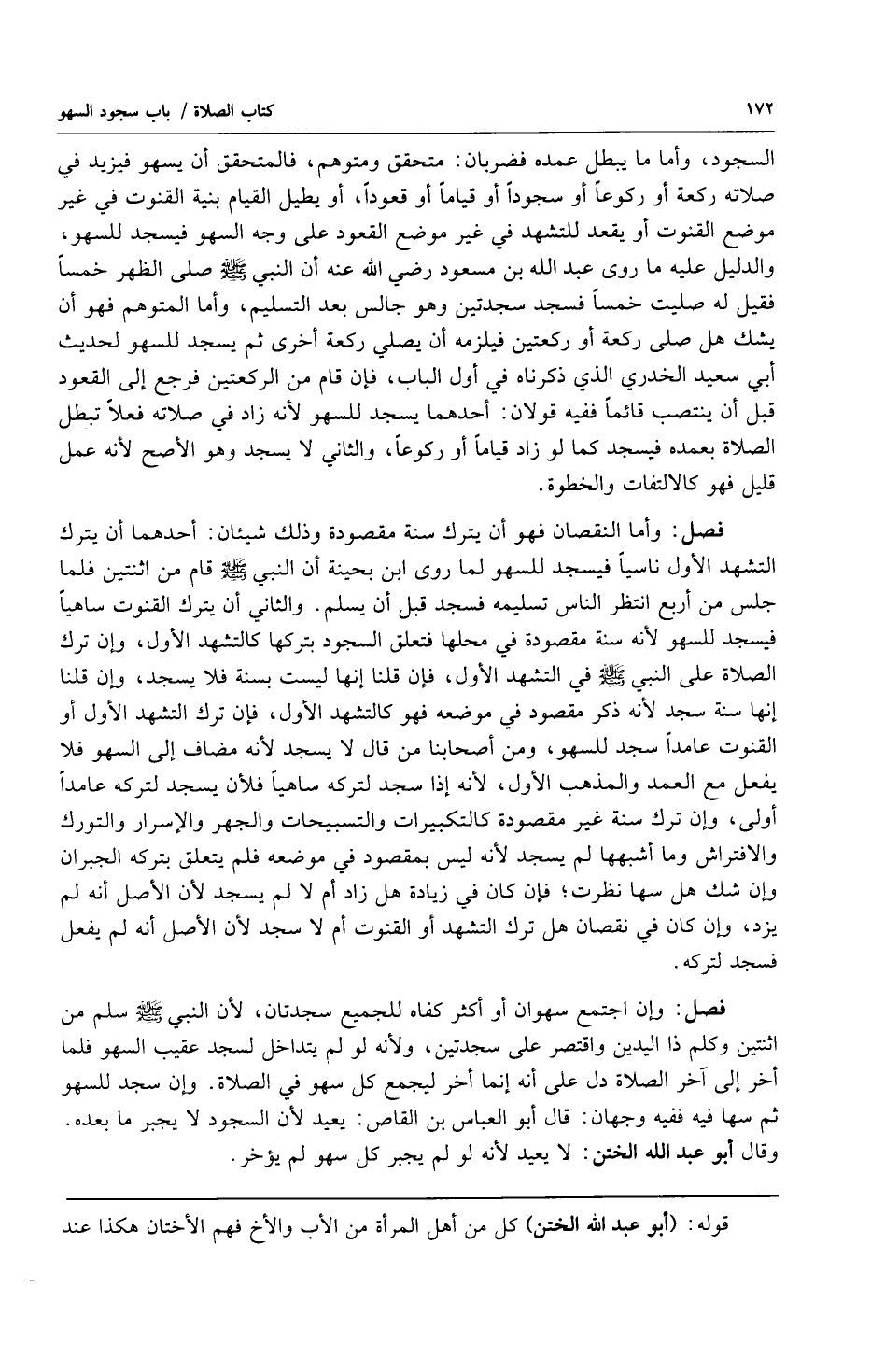 فصل: وأما النقصان فهو أن يترك سنة مقصودة وذلك شيئان: أحدهما أن يترك التشهد الأول ناسياً فيسجد للسهو لما روى ابن بحينة أن النبي صلى الله عليه وسلم قام من اثنتين فلما جلس من أربع انتظر الناس تسليمه فسجد قبل أن يسلم والثاني أن يترك القنوت ساهياً فيسجد للسهو لأنه سنة مقصودة في محلها فتعلق السجود بتركها كالتشهد الأول وإن ترك الصلاة على النبي صلى الله عليه وسلم في التشهد الأول فإن قلنا ليست بسنة فلا يسجد وإن قلنا إنها سنة سجد لأنه ذكر مقصود في موضعه فهو كالتشهد الأول فإن ترك التشهد الأول أو القنوت عامداً سجد للسهو ومن أصحابنا من قال لا يسجد لأنه مضاف إلى السهو فلا يفعل مع العمد والمذهب الأول لأنه إذا سجد لتركه ساهياً فلأن يسجد لتركه عامداً أولى وإن ترك سنة غير مقصودة كالتكبيرات والتسبيحات والجهر والإسرار والتورك والافتراش وما أشبهها لم يسجد لأنه ليس بمقصود في موضعه فلم يتعلق بتركه الجبران وإن شك هل سها نظرت فإن كان في زيادة هل زاد أم لا لم يسجد لأن الأصل أنه لم يزد وإن كان في نقصان هل ترك التشهد أو القنوت أم لا سجد لأن الأصل أنه لم يفعل فسجد لتركه.