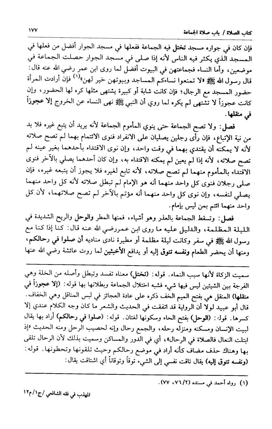 فإن كان في جواره مسجد تختل فيه الجماعة ففعلها في مسجد الجوار أفضل من فعلها في المسجد الذي يكثر فيه الناس لأنه صلى في مسجد الجوار حصلت الجماعة في موضعين وأما النساء فجماعتهن في البيوت أفضل لما روى ابن عمر رضي الله عنه قال: قال رسول الله صلى الله عليه وسلم "لا تمنعوا نساءكم المساجد وبيوتهن خير لهن1" فإن أرادت المرأة حضور المسجد مع الرجال فإن كانت شابة أو كبيرة يشتهى مثلها كره لها الحضور وإن كانت عجوزاً لا تشتهى لم يكره لما روي أن النبي صلى الله عليه وسلم نهى النساء عن الخروج إلا عجوزاً في منقلها.