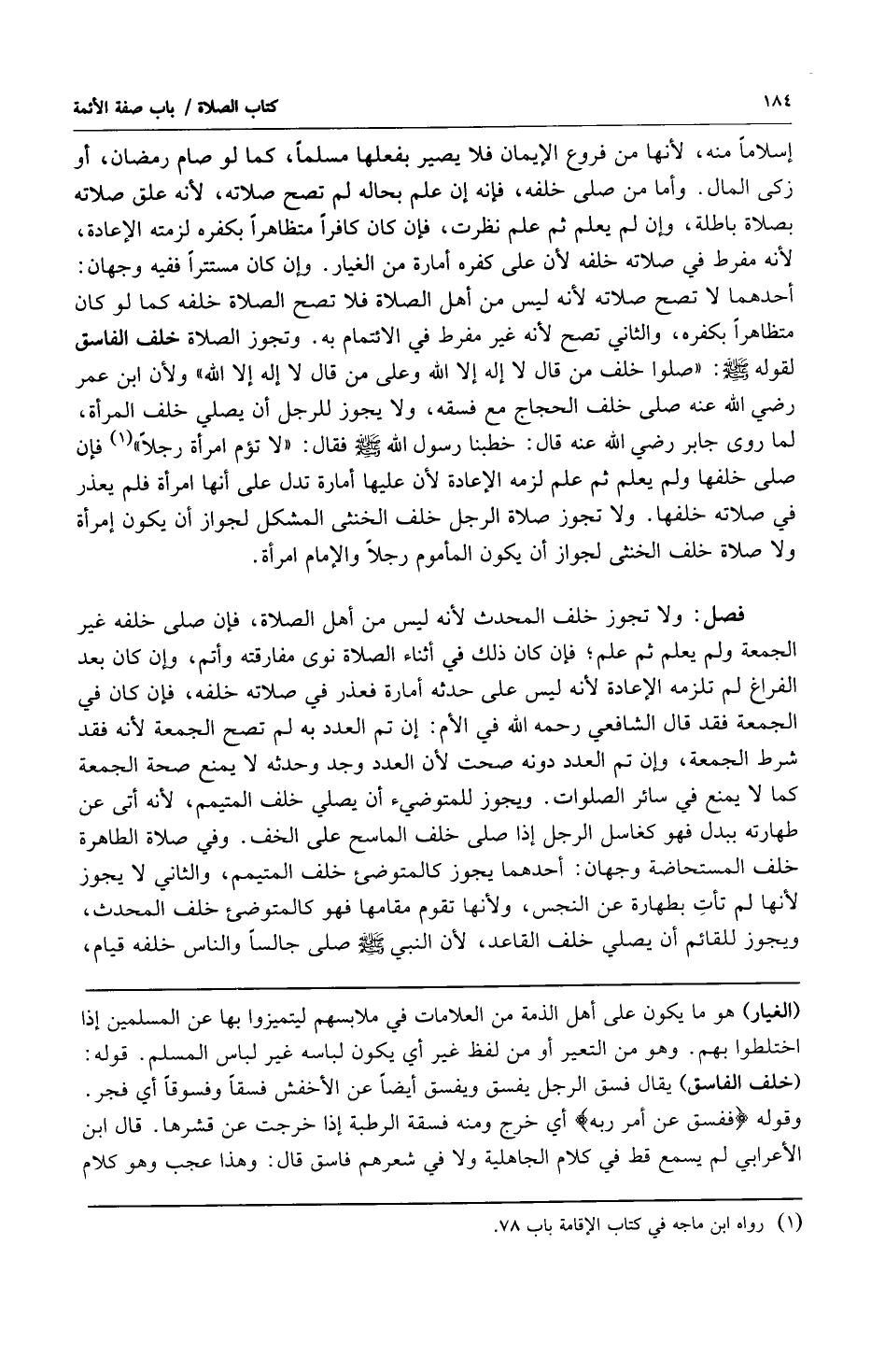 إسلاماً منه لأنها من فروع الإيمان فلا يصير بفعلها مسلماً كما لوصام رمضان أو زكى المال وأما من صلى خلفه فإنه إن علم بحالة لم تصح صلاته لأنه علق صلاته بصلاة باطلة وإن لم يعلم ثم علم نظرت فإن كان كافراً متظاهراً بكفره لزمته الإعادة لأنه مفرط في صلاته خلفه لأن على كفره أمارة من الغيار وإن كان مستتراً ففيه وجهان: أحدهما لا تصح صلاته لأنه ليس من أهل الصلاة فلا تصح الصلاة خلفه كما لو كان متظاهراً بكفره والثاني تصح لأنه غير مفرط في الائتمام به وتجوز الصلاة خلف الفاسق لقوله صلى الله عليه وسلم "صلوا خلف من قال لا إله إلا الله وعلى من قال لا إله إلا الله" ولأن ابن عمر رضي الله عنه صلى خلف الحجاج مع فسقه ولا يجوز للرجل أن يصلي خلف المرأة لما روى جابر رضي الله عنه قال: خطبنا رسول الله صلى الله عليه وسلم فقال: "لا تؤم امرأة رجلاً1" فإن صلى خلفها ولم يعلم ثم علم لزمه الإعادة لأن عليها أمارة تدل على أنها امرأة فلم يعذر في صلاته خلفها ولا تجوز صلاة الرجل خلف الخنثى المشكل لجواز أن يكون امرأة ولا صلاة خلف الخنثى لجواز أن يكون المأموم رجلاً والإمام امرأة.