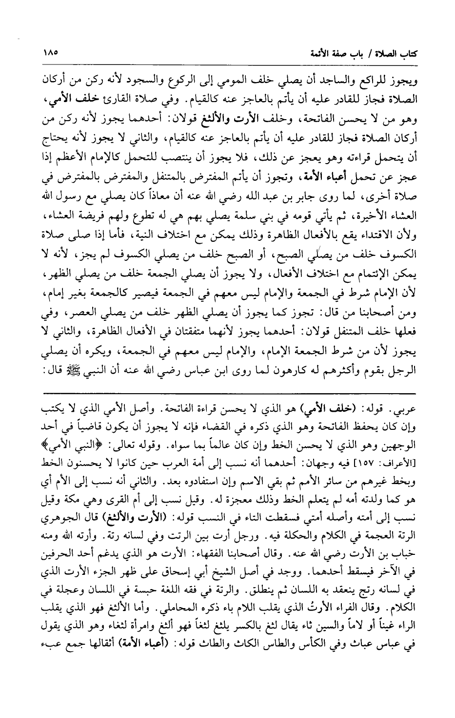 ويجوز للراكع والساجد أن يصلي خلف المومي إلى الركوع والسجود لأنه ركن من أركان الصلاة فجاز للقادر عليه أن يأتم بالعاجز عنه كالقيام وفي صلاة القارئ خلف الأمي وهو من لا يحسن الفاتحة وخلف الأرت والألثغ قولان: أحدهما يجوز لأنه ركن من أركان الصلاة فجاز للقادر عليه أن يأتم بالعاجز عنه كالقيام والثاني لا يجوز لأنه يحتاج أن يتحمل قراءته وهو يعجز عن ذلك فلا يجوز أن ينتصب للتحمل كالإمام الأعظم إذا عجز عن تحمل أعباء الأمة وتجوز أن يأتم المفترض بالمتنفل والمفترض بالمفترض في صلاة أخرى لما روى جابر بن عبد الله رضي الله عنه أن معاذاً كان يصلي مع رسول الله صلى الله عليه وسلم العشاء الأخيرة ثم يأتي قومه في بني سلمة يصلي بهم هي له تطوع ولهم فريضة العشاء ولأن الاقتداء يقع بالأفعال الظاهرة وذلك يمكن مع اختلاف النية فأما إذا صلى صلاة الكسوف خلف من يصلي الصبح أو الصبح خلف من يصلي الكسوف لم يجز لأنه لا يمكن الإئتمام مع اختلاف الأفعال ولا يجوز أن يصلي الجمعة خلف من يصلي الظهر لأن الإمام شرط في الجمعة والإمام ليس معهم في الجمعة فيصير كالجمعة بغير إمام ومن أصحابنا من قال: تجوز كما يجوز أن يصلي الظهر خلف من يصلي العصر وفي فعلها خلف المتنفل قولان: أحدهما يجوز لأنهما متفقان في الأفعال الظاهرة والثاني لا يجوز لأن من شرط الجمعة الإمام والإمام ليس معهم في الجمعة ويكره أن يصلي الرجل بقوم وأكثرهم له كارهون لما روى ابن عباس رضي الله عنه أن النبي صلى الله عليه وسلم قال: