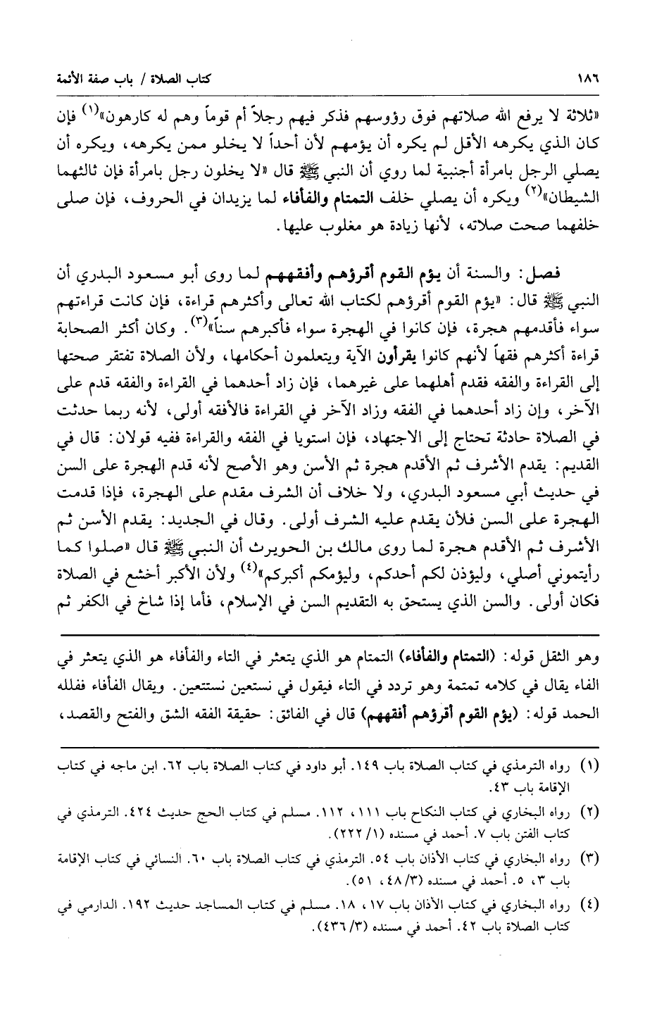 فصل: والسنة أن يؤم القوم أقرؤهم وأفقههم لما روى أبو مسعود البدري أن النبي صلى الله عليه وسلم قال "يؤم القوم أقرؤهم لكتاب الله تعالى وأكثرهم قراءة فإن كانت قراءتهم سواء فأقدمهم هجرة فإن كانوا في الهجرة سواء فأكبرهم سناً3" وكان أكثر الصحابة قراءة أكثرهم فقهاً لأنهم كانوا يقرأون ويتعلمون أحكامها ولأن الصلاة تفتقر صحتها إلى القراءة والفقه فقدم أهلهما على غيرهما فإن زاد أحدهما في القراءة والفقه قدم على الآخر وإن زاد أحدهما في الفقه وزاد الآخر في القراءة فالأفقه أولى لأنه ربما حدثت في الصلاة حادثة تحتاج إلى الاجتهاد فإن استويا في الفقه ففيه قولان: قال في القديم يقدم الأشرف ثم الأقدم هجرة ثم الأسن وهو الأصح لأنه قدم الهجرة على السن في حديث أبي مسعود البدري ولا خلاف أن الشرف مقدم على الهجرة فإذا قدمت الهجرة على السن فلأن يقدم عليه الشرف أولى وقال في الجديد: يقدم الأسن ثم الأشرف ثم الأقدم هجرة لما روى مالك بن الحويرث أن النبي صلى الله عليه وسلم قال "صلوا كما رأيتموني أصلي وليؤذن لكم أحدكم وليؤمكم أكبركم4" ولأن الأكبر أخشع في الصلاة فكان أولى والسن الذي يستحق به التقديم السن في الإسلام فأما إذا شاخ في الكفر ثم