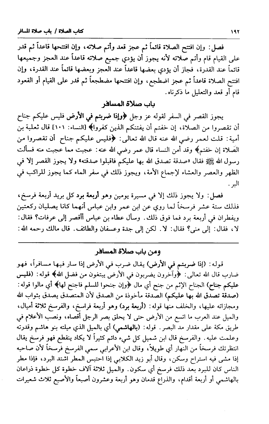 يجوز القصر في السفر لقوله عز وجل {وَإِذَا ضَرَبْتُمْ فِي الْأَرْضِ فَلَيْسَ عَلَيْكُمْ جُنَاحٌ أَنْ تَقْصُرُوا مِنَ الصَّلاةِ إِنْ خِفْتُمْ أَنْ يَفْتِنَكُمُ الَّذِينَ كَفَرُوا} [النساء:101] قال ثعلبة بن أمية: قلت لعمر رضي الله عنه قال الله تعالى: {فَلَيْسَ عَلَيْكُمْ جُنَاحٌ أَنْ تَقْصُرُوا مِنَ الصَّلاةِ إِنْ خِفْتُمْ} [النساء:101] وقد أمن النساء قال عمر رضي الله عنه: عجبت مما عجبت منه فسألت رسول الله صلى الله عليه وسلم فقال "صدقة تصدق الله بها عليكم فاقبلوا صدقته" ولا يجوز القصر إلا في الظهر والعصر والعشاء لإجماع الأمة ويجوز ذلك في سفر الماء كما يجوز للراكب في البر.