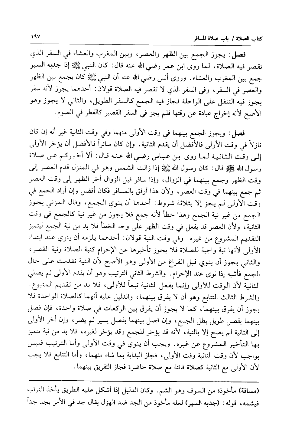 فصل: يجوز الجمع بين الظهر والعصر وبين المغرب والعشاء في السفر الذي تقصر فيه الصلاة لما روى ابن عمر رضي الله عنه قال: كان النبي صلى الله عليه وسلم إذا جد به السير جمع بين المغرب والعشاء وروى أنس رضي الله عنه أن النبي صلى الله عليه وسلم كان يجمع بين الظهر والعصر في السفر وفي السفر الذي لا تقصر فيه صلاة قولان: أحدهما يجوز لأنه سفر يجوز فيه التنفل على الراحلة فجاز فيه الجمع كالسفر الطويل والثاني لا يجوز وهو الأصح لأنه إخراج عبادة عن وقتها فلم يجز في السفر القصير كالفطر في الصوم.