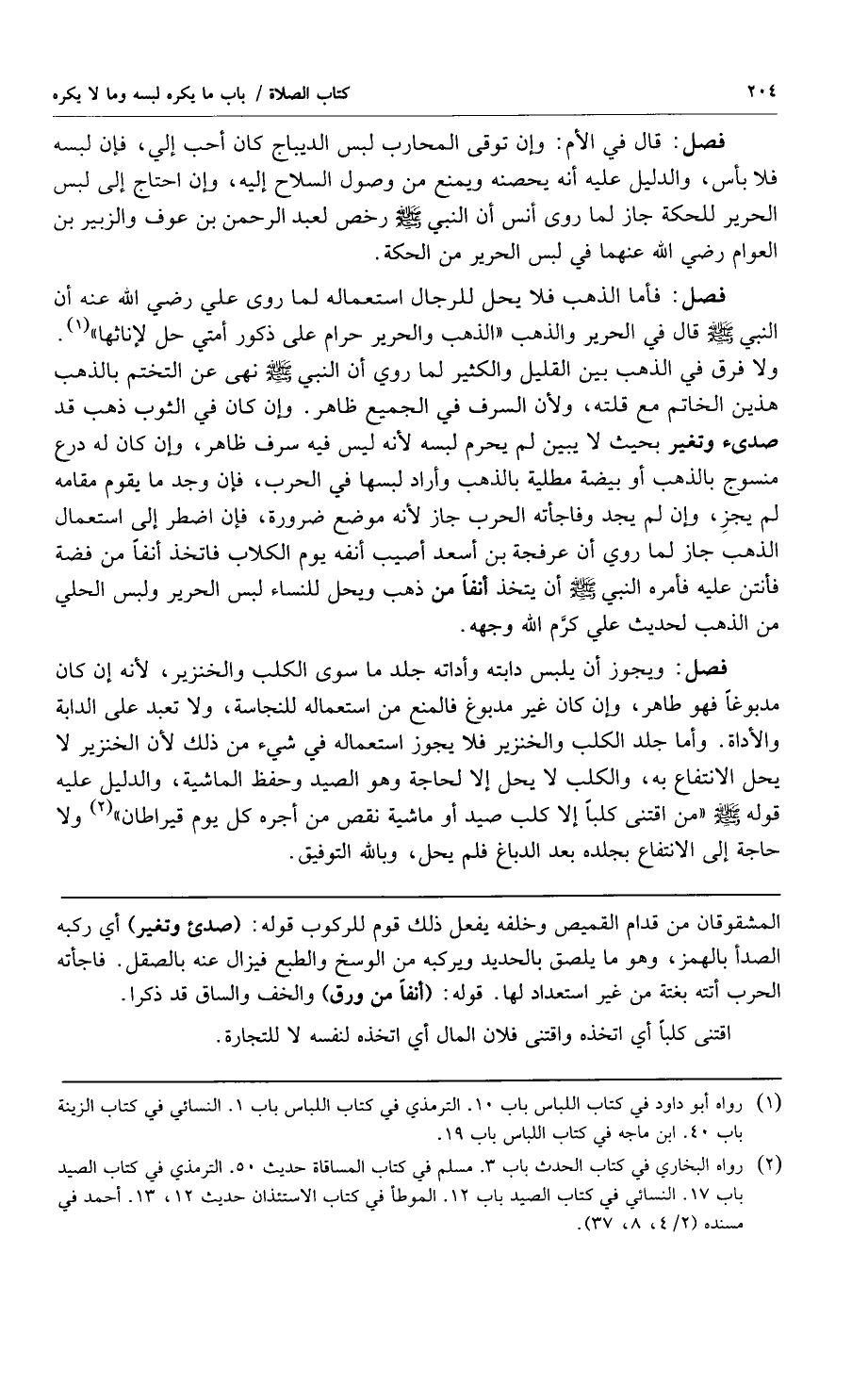 فصل: ويجوز أن يلبس دابته وأداته جلد ما سوى الكلب والخنزير لأنه إن كان مدبوغاً فهو طاهر وإن كان غير مدبوغ فالمنع من استعماله للنجاسة ولا تعبد على الدابة والأداة وأما جلد الكلب والخنزير فلا يجوز استعماله في شيء من ذلك لأن الخنزير لا يحل الانتفاغ به والكلب لا يحل إلا لحاجة وهي الصيد وحفظ الماشية والدليل عليه قوله صلى الله عليه وسلم "من اقتنى كلباً إلا كلب صيد أو ماشية نقص من أجره كل يوم قيراطان2" ولا حاجة إلى الانتفاع بجلده بعد الدباغ فلم يحل وبالله التوفيق.