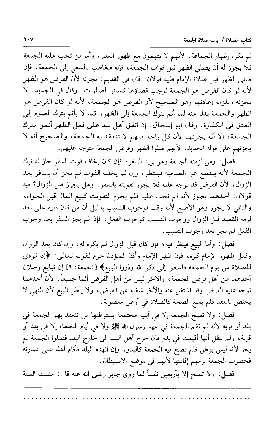فصل: ومن لزمته الجمعة وهو يريد السفر فإن كان يخاف فوت السفر جاز له ترك الجمعة لأنه ينقطع عن الصحبة فينتظر وإن لم يخف الفوت لم يجز أن يسافر بعد الزوال لأن الفرض توجه عليه فلا يجوز تفويته بالسفر وهل يجوز قبل الزوال؟ فيه قولان: أحدهما يجوز لأنه لم تجب عليه فلم يحرم التفويت كبيع المال قبل الحول والثاني لا يجوز وهو الأصح لأنه وقت لوجوب التسبب بدليل أنه من كان داره على بعد لزمه القصد قبل الزوال ووجوب التسبب كوجوب الفعل فإذا لم يجز السفر بعد وجوب الفعل لم يجز بعد وجوب التسبب.