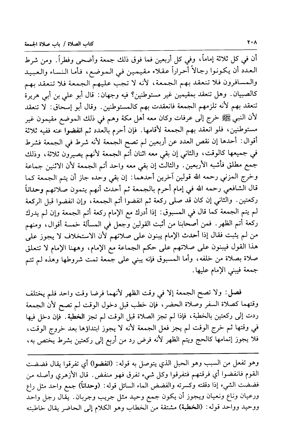 أن في كل ثلاثة إماماً وفي كل أربعين فما فوق ذلك جمعة وأضحى وفطراً ومن شرط العدد أن يكونوا رجالاً أحراراً عقلاء مقيمين في الموضع فأما النساء والعبيد والمسافرون فلا تنعقد بهم الجمعة لأنه لا تجب عليهم الجمعة فلا تنعقد بهم كالصبيان وهل تنعقد بمقيمين غير مستوطنين؟ فيه وجهان: قال أبو علي بن أبي هريرة تنعقد بهم لأنه تلزمهم الجمعة فانعقدت بهم كالمستوطنين وقال أبو إسحاق: لا تنعقد لأن النبي صلى الله عليه وسلم خرج إلى عرفات وكان معه أهل مكة وهم في ذلك الموضع مقيمون غير مستوطنين فلو انعقد بهم الجمعة لأقامها فإن أحرم بالعدد ثم انفضوا عنه ففيه ثلاثة أقوال: أحدها إن نقص العدد عن أربعين لم تصح الجمعة لأنه شرط في الجمعة فشرط في جميعها كالوقت والثاني إن بقي معه اثنان أتم الجمعة لأنهم يصيرون ثلاثة وذلك جمع مطلق فأشبه الأربعين والثالث إن بقي معه واحد أتم الجمعة لأن الاثنين جماعة وخرج المزني رحمه الله قولين آخرين أحدهما: إن بقي وحده جاز أن يتم الجمعة كما قال الشافعي رحمه الله في إمام أحرم بالجمعة ثم أحدث أنهم يتمون صلاتهم وحداناً ركعتين والثاني إن كان قد صلى ركعة ثم انفضوا أتم الجمعة وإن انفضوا قبل الركعة لم يتم الجمعة كما قال في المسبوق: إذا أدرك مع الإمام ركعة أتم الجمعة وإن لم يدرك ركعة أتم الظهر فمن أصحابنا من أثبت القولين وجعل في المسألة خمسة أقوال ومنهم من لم يثبت فقال إذا أحدث الإمام يبنون على صلاتهم لأن الاستخلاف لا يجوز على هذا القول فيبنون على صلاتهم على حكم الجماعة مع الإمام وههنا الإمام لا تتعلق صلاة بصلاة من خلفه وأما المسبوق فإنه يبني على جمعة تمت شروطها وهذه لم تتم جمعة فيبني الإمام عليها.