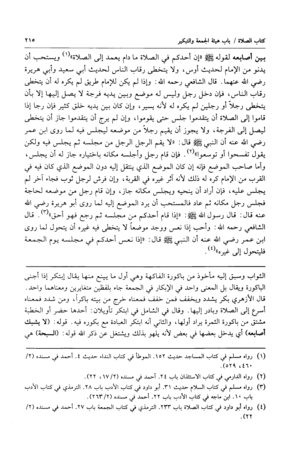 بين أصابعه لقوله صلى الله عليه وسلم "إن أحدكم في الصلاة ما دام يعمد إلى الصلاة1" ويستحب أن يدنو من الإمام لحديث أوس ولا يتخطى رقاب الناس لحديث أبي سعيد وأبي هريرة رضي الله عنهما قال الشافعي رحمه الله: وإذا لم يكن للإمام طريق لم يكره له أن يتخطى رقاب الناس فإن دخل رجل وليس له موضع وبين يديه فرجة لا يصل إليها إلا بأن يتخطى رجل أو رجلين لم يكره له لأنه يسير وإن كان بين يديه خلق كثير فإذا رجا إذا قاموا إلى الصلاة أن يتقدموا جلس حتى يقوموا وإن لم يرج أن يتقدموا جاز أن يتخطى ليصل إلى الفرجة ولا يجوز أن يقوم رجلاً من موضعه ليجلس فيه لما روى ابن عمر رضي الله عنه أن النبي صلى الله عليه وسلم قال: "لا يقم الرجل الرجل من مجلسه ثم يجلس فيه ولكن يقول تفسحوا أو توسعوا2" فإن قام رجل وأجلسه مكانه باختياره جاز له أن يجلس وأما صاحب الموضع فإنه إن كان الموضع الذي ينتقل إليه دون الموضع الذي كان فيه في القرب من الإمام كره له ذلك لأنه آثر غيره في القربة وإن فرش لرجل ثوب فجاء آخر لم يجلس عليه فإن أراد أن ينحيه ويجلس مكانه جاز وإن قام رجل من موضعه لحاجة فجلس رجل مكانه ثم عاد فالمستحب أن يرد الموضع إليه لما روى أبو هريرة رضي الله عنه قال: قال رسول الله صلى الله عليه وسلم: "إذا قام أحدكم من مجلسه ثم رجع فهو أحق3" قال الشافعي رحمه الله: وأحب إذا نعس ووجد موضعاً لا يتخطى فيه غيره أن يتحول لما روى ابن عمر رضي الله عنه أن النبي صلى الله عليه وسلم قال: "إذا نعس أحدكم في مجلسه يوم الجمعة فليتحول إلى غيره "4.