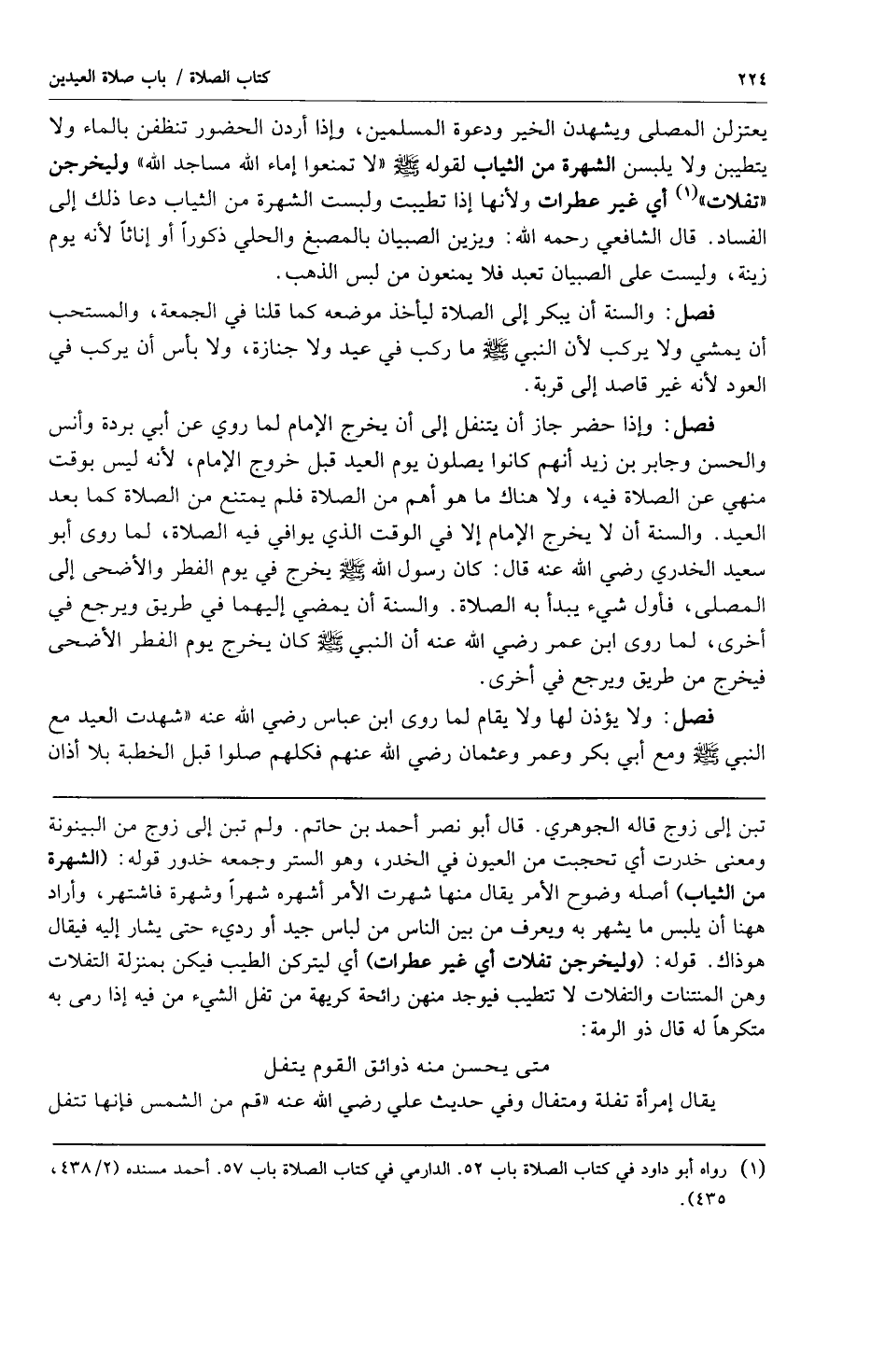 فصل: وإذا حضر جاز أن يتنفل إلى أن يخرج الإمام لما روي عن أبي بردة وأنس والحسن وجابر بن زيد أنهم كانوا يصلون يوم العيد قبل خروج الإمام لأنه ليس بوقت منهي عن الصلاة فيه ولا هناك ما هو أهم من الصلاة فلم يمتنع من الصلاة كما بعد العيد والسنة أن لا يخرج الإمام إلا في الوقت الذي يوافي فيه الصلاة لما روى أبو سعيد الخدري رضي الله عنه قال: كان رسول الله صلى الله عليه وسلم يخرج في يوم الفطر والأضحى إلى المصلى فأول شيء يبدأ به الصلاة والسنة أن يمضي إليهما في طريق ويرجع في أخرى لما روى ابن عمر رضي الله عنه أن النبي صلى الله عليه وسلم كان يخرج يوم الفطر الأضحى فيخرج من طريق ويرجع في أخرى.