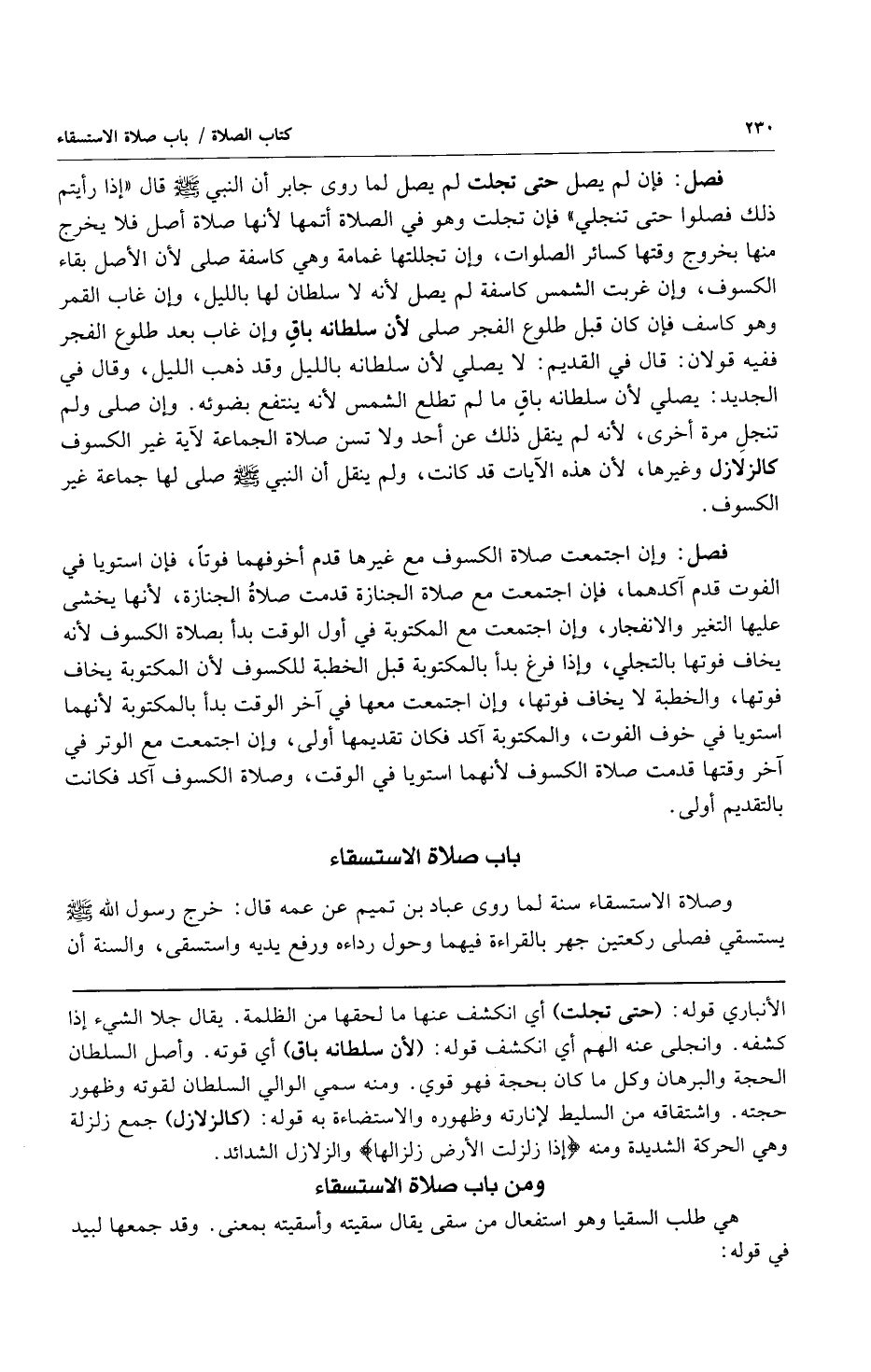 فصل: فإن لم يصل حتى تجلت لم يصل لما روى جابر أن النبي صلى الله عليه وسلم قال: "إذا رأيتم ذلك فصلوا حتى تنجلي" فإن تجلت وهو في الصلاة أتمها لأنها صلاة أصل فلا يخرج منها بخروج وقتها كسائر الصلوات وإن تجللتها غمامة وهي كاسفة صلى لأن الأصل بقاء الكسوف وإن غربت الشمس كاسفة لم يصل لأنه لا سلطان لها بالليل وإن غاب القمر وهو كاسف فإن كان قبل طلوع الفجر صلى لأنه سلطان باق وإن غاب بعد طلوع الفجر ففيه قولان: قال في القديم: لا يصلي لأنه سلطانه بالليل وقد ذهب الليل وقال في الجديد: يصلي لأن سلطانه باق ما لم تطلع الشمس لأنه ينتفع بضوئه وإن صلى ولم تنجل مرة أخرى لأنه لم ينقل ذلك عن أحد ولا تسن صلاة الجماعة لآية غير الكسوف كالزلازل وغيرها لأن هذه الآيات قد كانت ولم ينقل أن النبي صلى الله عليه وسلم صلى لها جماعة غير الكسوف.