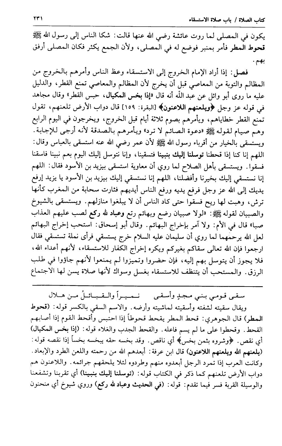 فصل: إذا أراد الإمام الخروج إلى الاستسقاء وعظ الناس وأمرهم بالخروج من المظالم والتوبة من المعاصي قبل أن يخرج لأن المظالم والمعاصي تمنع المطر والدليل عليه ما روى أبو وائل عن عبد الله أنه قال: "إذا بخس المكيال حبس القطر" وقال مجاهد في قوله عز وجل {وَيَلْعَنُهُمُ اللَّاعِنُونَ} [البقرة:159] قال دواب الأرض تلعنهم تقول تمنع القطر خطاياهم ويأمرهم بصوم ثلاثة أيام قبل الخروج ويخرجون في اليوم الرابع وهم صيام لقوله صلى الله عليه وسلم "دعوة الصائم لا ترد" ويأمرهم بالصدقة لأنه أرجى للإجابة ويستسقى بالخيار من أقرباء رسول الله صلى الله عليه وسلم لأن عمر رضي الله عنه استسقى بالعباس وقال: اللهم إنا كنا إذا قحطنا توسلنا إليك بنبينا فتسقينا وإنا نتوسل إليك اليوم بعم نبينا فاسقنا فسقوا ويستسقى بأهل الصلاح لما روي أن معاوية استسقى بيزيد بن الأسود فقال: اللهم إنا نستسقي إليك بخيرنا وأفضلنا اللهم إنا نستسقي إليك بيزيد بن الأسود يا يزيد إرفع يديك إلى الله عز وجل فرفع يديه ورفع الناس أيديهم فثارت سحابة من المغرب كأنها ترش وهبت لها ريح فسقوا حتى كاد الناس أن لا يبلغوا منازلهم ويستسقى بالشيوخ والصبيان لقوله صلى الله عليه وسلم: "لولا صبيان رضع وبهائم رتع وعباد لله ركع لصب عليهم العذاب صبا" قال في الأم: ولا آمر بإخراج البهائم وقال أبو إسحاق: استحب إخراج البهائم لعل الله يرحمهما لما روي أن سليمان عليه السلام خرج يستسقي فرأى نملة تستسقي فقال ارجعوا فإن الله تعالى سقاكم بغيركم ويكره إخرج الكفار للاستسقاء لأنهم أعداء الله فلا يجوز أن يتوسل بهم إليه فإن حضروا وتميزوا لم يمنعوا لأنهم جاؤوا في طلب الرزق والمستحب أن يتنظف للاستسقاء بغسل وسواك لأنها صلاة يسن لها الاجتماع