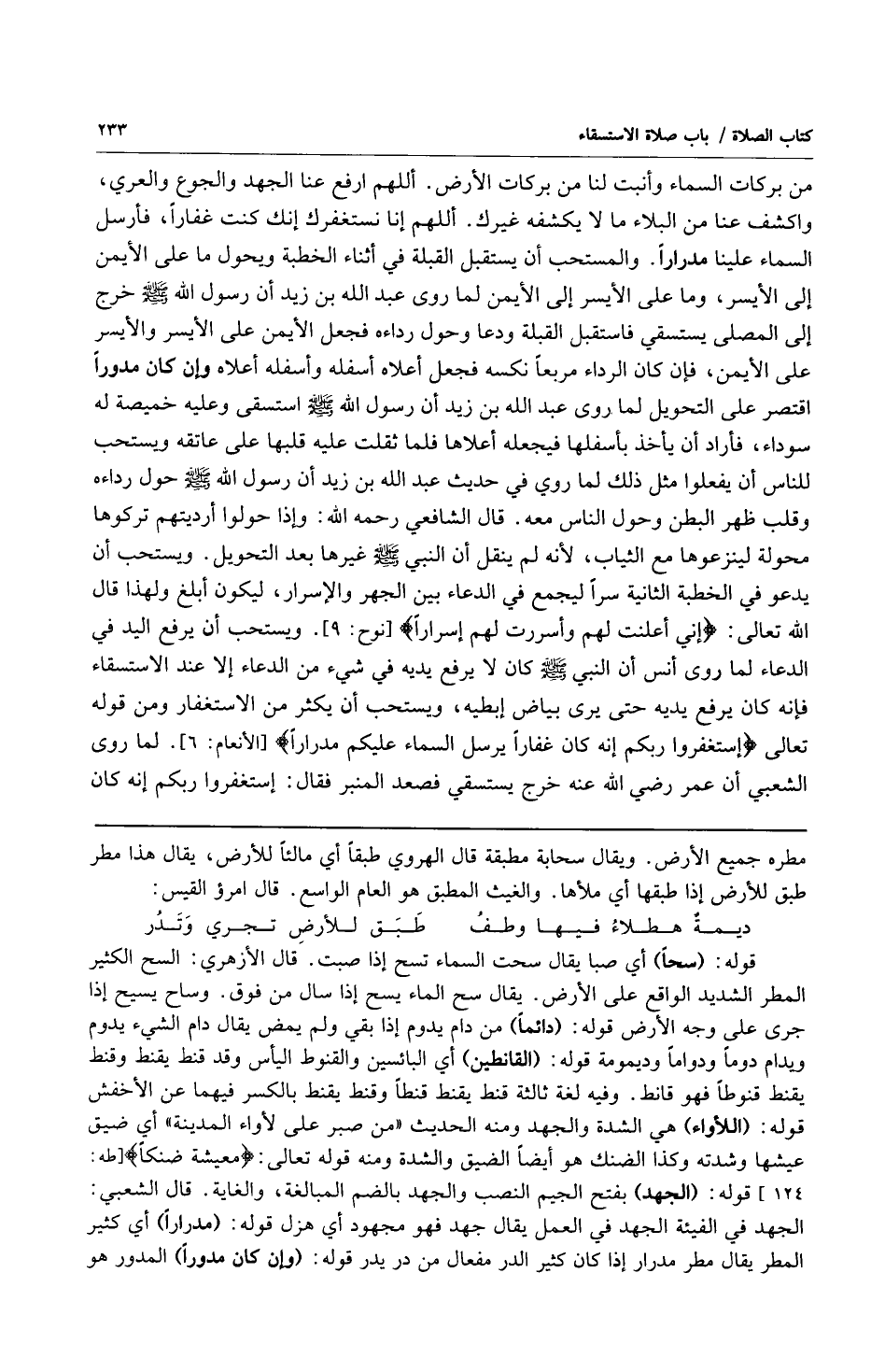 من بركات السماء وأنبت لنا من بركات الأرض أللهم ارفع عنا الجهد والجوع والعري واكشف عنا من البلاء ما لا يكشفه غيرك أللهم إنا نستغفرك إنك كنت غفاراً فأرسل الماء علينا مدراراً والمستحب أن يستقبل القبلة في أثناء الخطبة ويحول ما على الأيمن إلى الأيسر وما على الأيسر إلى الأيمن لما روى عبد الله بن زيد أن رسول الله صلى الله عليه وسلم خرج إلى المصلى يستسقي فاستقبل القبلة ودعا وحول رداءه فجعل الأيمن على اليسر والأيسر على الأيمن فإن كان الرداء مربعاً نكسه فجعل أعلاه أسفله وأسفله أعلاه وإن كان مدوراً اقتصر على التحويل لما روى عبد الله بن زيد أن رسول الله صلى الله عليه وسلم استسقى وعليه خميصة له سوداء فأراد أن يأخذ بأسفلها فيجعله أعلاها فلما ثقلت عليه قلبها على عاتقه ويستحب للناس أن يفعلوا مثل ذلك لما روي في حديث عبد الله بن زيد أن رسول الله صلى الله عليه وسلم حول رداءه وقلب ظهر البطن وحول الناس معه قال الشافعي رحمه الله: وإذا حولوا أرديتهم تركوها محولة لينزعوها مع الثياب لأنه لم ينقل أن النبي صلى الله عليه وسلم غيرها بعد التحويل ويستحب أن يدعو في الخطبة الثانية سراً ليجمع في الدعاء بين الجهر والإسرار ليكون أبلغ ولهذا قال الله تعالى {إِنِّي أَعْلَنْتُ لَهُمْ وَأَسْرَرْتُ لَهُمْ إِسْرَاراً} [نوح:9] ويستحب أن يرفع اليد في الدعاء لما روى أنس أن النبي صلى الله عليه وسلم كان لا يرفع يديه في شيء من الدعاء إلا عند الاستسقاء فإنه كان يرفع يديه حتى يرى بياض إبطيه ويستحب أن يكثر من الاستغفار ومن قوله تعالى {اسْتَغْفِرُوا رَبَّكُمْ إِنَّهُ كَانَ غَفَّاراً يُرْسِلِ السَّمَاءَ عَلَيْكُمْ مِدْرَاراً} [هود:52] لما روى الشعبي أن عمر رضي الله عنه خرج يستسقي فصعد المنبر فقال: {اسْتَغْفِرُوا رَبَّكُمْ إِنَّهُ كَانَ