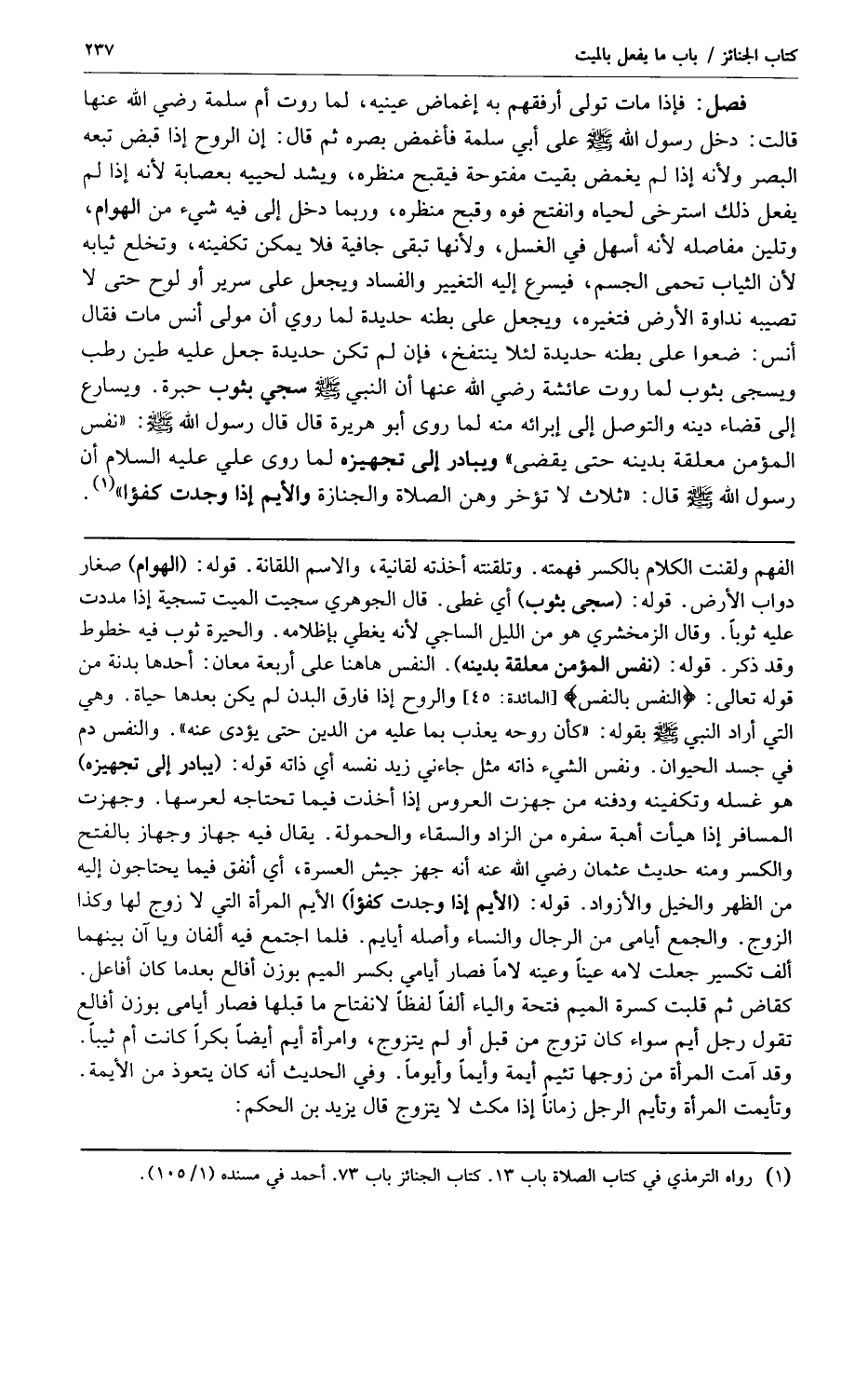 فصل: فإذا مات تولى أرفقهم به إغماض عينيه لما روت أم سلمة رضي الله عنها قالت: دخل رسول الله صلى الله عليه وسلم على أبي سلمة فأغمض بصره ثم قال: "إن الروح إذا قبض تبعه البصر" ولأنه إذا لم يغمض بقيت مفتوحة فيقبح منظره ويشد حييه بعصابة لأنه إذا لم يفعل ذلك استرخى لحياه وانفتح فوه وقبح منظره وربما دخل إلى فيه شيء من الهوام وتلين مفاصله لأنه أسهل في الغسل ولأنها تبقى جافية فلا يمكن تكفينه وتخلع ثيابه لأن الثياب تحمى الجسم فيسرع إليه التغيير والفساد ويجعل على سرير أو لوح حتى لا تصيبه نداوة الأرض فتغيره ويجعل على بطنه حديدة لما روي أن مولى أنس مات فقال أنس: ضعوا على بطنه حديدة لئلا ينتفخ فإن لم تكن جديدة جعل عليه طين رطب ويسجى بثوب لما روت عائشة رضي الله عنها أن النبي صلى الله عليه وسلم سجي بثوب حبرة ويسارع إلى قضاء دينه والتوصل إلى إبرائه منه لما روى أبو هريرة قال قال رسول الله صلى الله عليه وسلم: "نفس المؤمن معلقة بدينه حتى يقضى" ويبادر إلى تجهيزه لما روى علي عليه السلام أن رسول الله صلى الله عليه وسلم قال: "ثلاث لا تؤخر وهن الصلاة والجنازة والأيم إذا وجدت كفؤاً1"