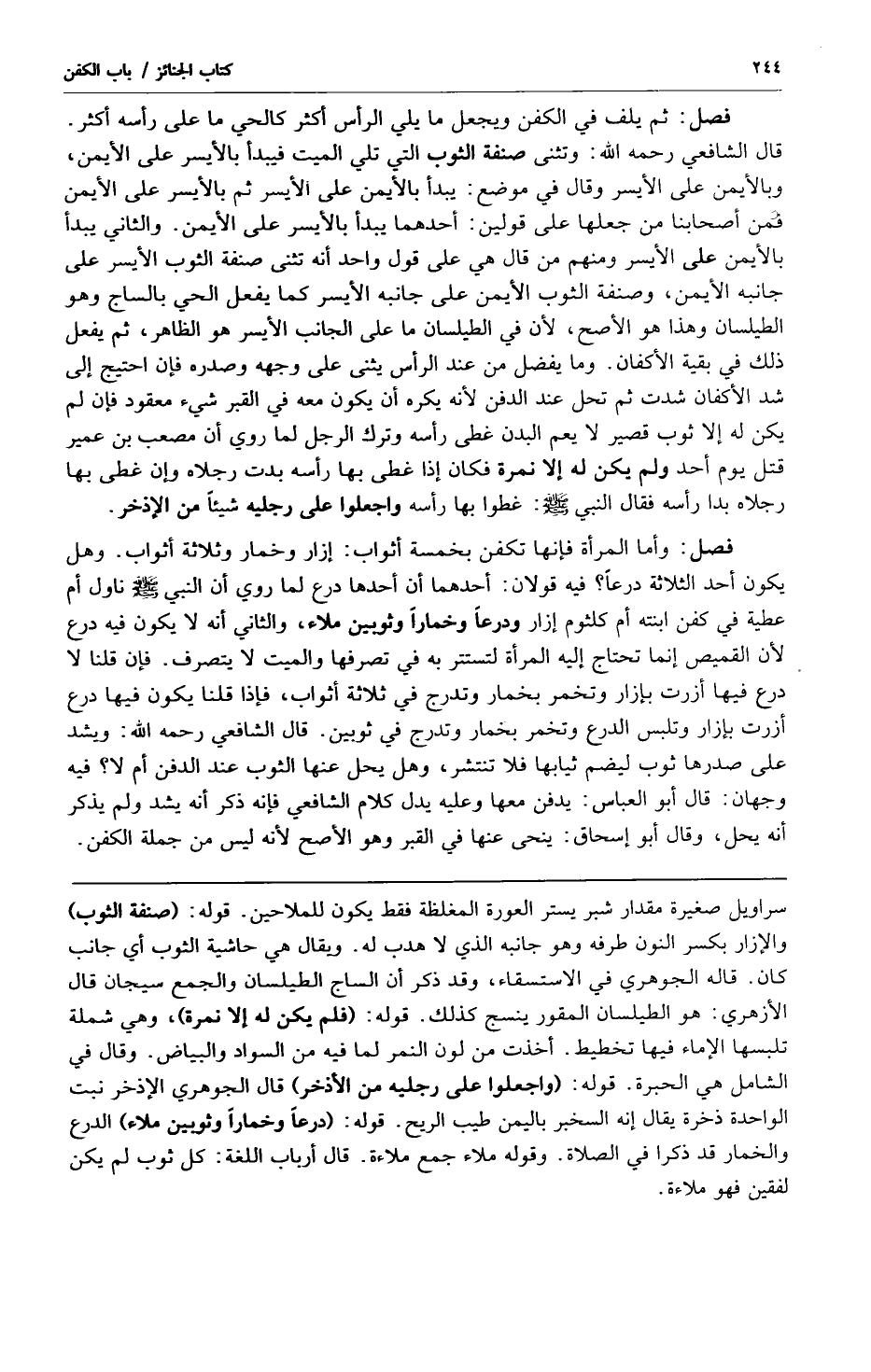 فصل: ثم يلف في الكفن ويجعل ما يلي الرأس أكثر كالحي ما على رأسه أكثر قال الشافعي رحمه الله: وتثنى صنفة الثوب التي تلي الميت فيبدأ بالأيسر على الأيمن وبالأيمن على الأيسر وقال في موضع: يبدأ بالأيمن على الأيسر ثم بالأيسر على الأيمن فمن أصحابنا من جعلها على قولين: أحدهما يبدأ بالأيسر على الأيمن والثاني يبدأ بالأيمن على الأيسر ومنهم من قال هي على قول واحد أنه تثنى صنفة الثوب الأيسر على جانبه الأيمن وصنفة الثوب الأيمن على جانبه الأيسر كما يفعل الحي بالساج وهو الطيلسان وهذا هو الأصح لأن في الطيلسان ما على الجانب الأيسر هو الظاهر ثم يفعل ذلك في بقية الأكفان وما يفضل من عند الرأس يثنى على وجهه وصدره فإن احتيج إلى شد الأكفان شدت ثم تحل عند الدفن لأنه يكره أن يكون معه في القبر شيء معقود فإن لم يكن له إلا ثوب قصير لا يعم البدن غطى رأسه وترك الرجل لما روي أن مصعب بن عمير قتل يوم أحد ولم يكن له إلا نمرة فكان إذا غطى بها رأسه بدت رجلاه وإن غطى بها رجلاه بدا رأسه فقال النبي صلى الله عليه وسلم: "غطوا بها رأسه واجعلوا على رجليه شيئاً من الإذخر".