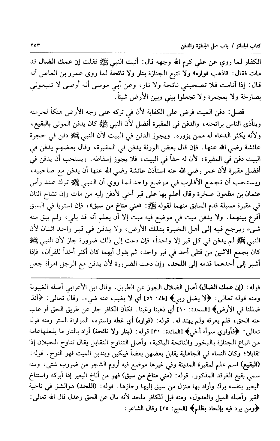 الكفار لما روي عن علي كرم الله وجهه قال: أتيت النبي صلى الله عليه وسلم فقلت إن عمك الضال قد مات فقال: "اذهب فواره" ولا تتبع الجنازة بنار ولا نائحة لما روى عمرو بن العاص أنه قال: إذا أنا مت فلا تصحبني نائحة ولا نار وعن أبي موسى أنه أوصى لا تتبعوني بصارخة ولا بمجمرة ولا تجعلوا بيني وبين الأرض شيئاً.