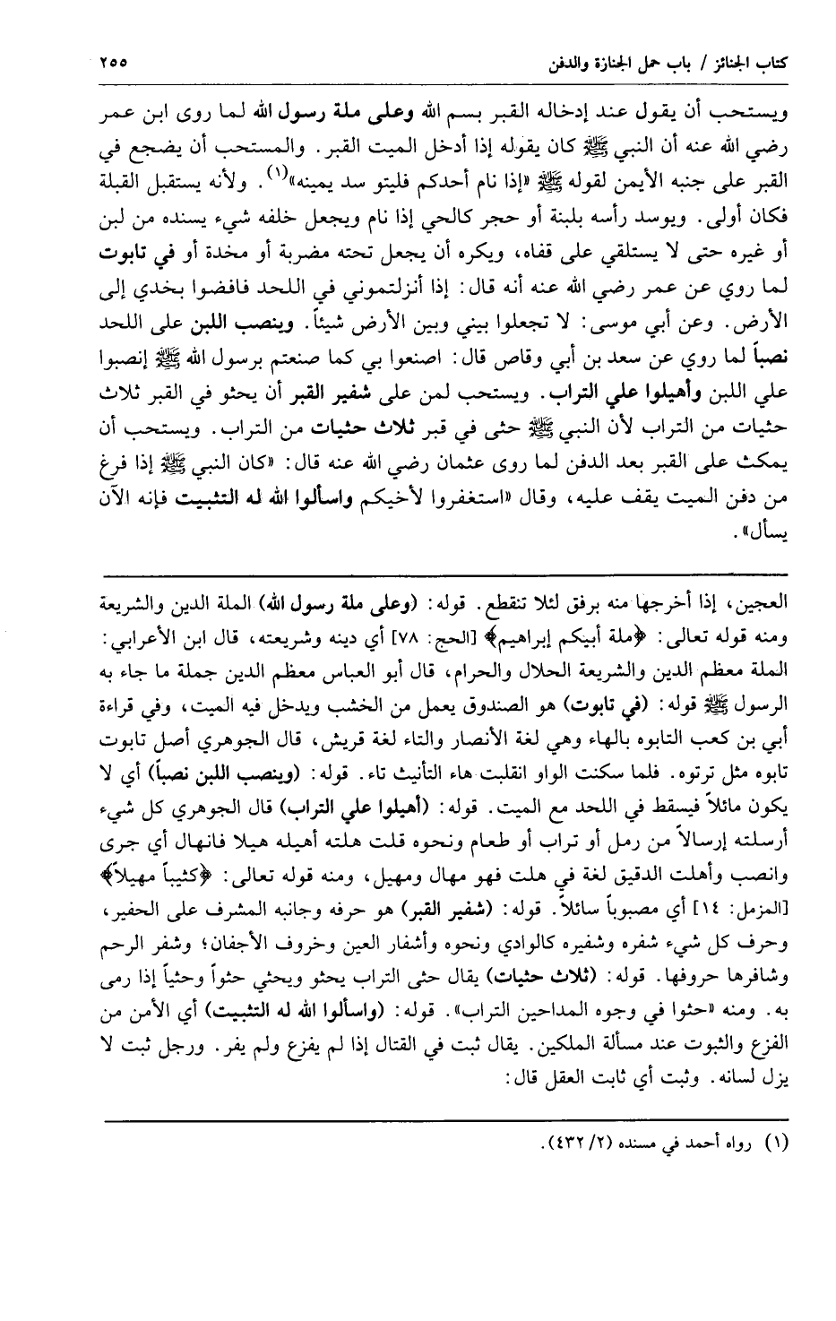 ويستحب أن يقول عند إدخاله القبر بسم الله وعلى ملة رسول الله لما روى ابن عمر رضي الله عنه أن النبي صلى الله عليه وسلم كان يقوله إذا أدخل الميت القبر والمستحب أن يضجع في القبر على جنبه الأيمن لقوله صلى الله عليه وسلم "إذا نام أحدكم فليتوسد يمينه1" ولأنه يستقبل القبلة فكان أولى ويوسد رأسه بلبنة أو حجر كالحي إذا نام ويجعل خلفه شيء يسنده من لبن أو غيره حتى لا يستلقي على قفاه ويكره أن يجعل تحته مضربة أو مخدة أو في تابوت لما روي عن عمر رضي الله عنه أنه قال: إذا أنزلتموني في اللحد فافضوا بخدي إلى الأرض وعن أبي موسى: لا تجعلوا بيني وبين الأرض شيئاً وينصب اللبن على اللحد نصباً لما روي عن سعد بن أبي وقاص قال: اصنعوا بي كما صنعتم برسول الله صلى الله عليه وسلم إنصبوا علي اللبن وأهيلوا علي التراب ويستحب لمن على شفير القبر أن يحثو في القبر ثلاث حثيات من التراب لأن النبي صلى الله عليه وسلم حثى في قبر ثلاث حثيات من التراب ويستحب أن يمكث على القبر بعد الدفن لما روى عثمان رضي الله عنه قال: كان النبي صلى الله عليه وسلم إذا فرغ من دفن الميت يقف عليه وقال "استغفروا لأخيكم واسألوا الله له التثبيت فإنه الآن يسأل".