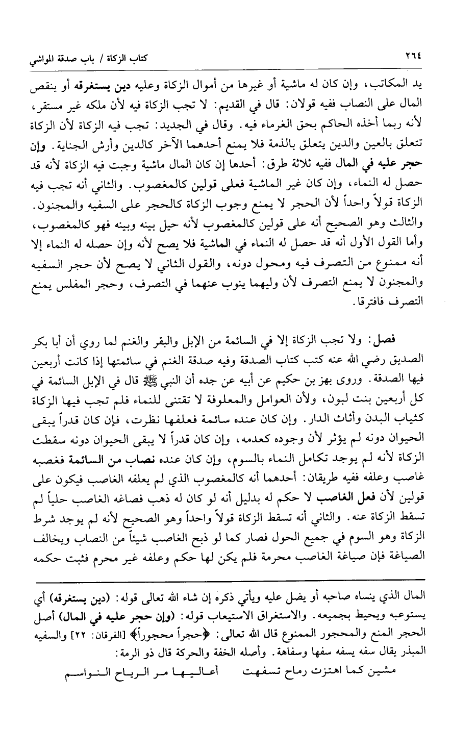 يد المكاتب وإن كان له ماشية أو غيرها من أموال الزكاة وعليه دين يستغرقه أو ينقص المال على النصاب ففيه قولان: قال في القديم: لا تجب الزكاة فيه لأن ملكه غير مستقر لأنه ربما أخذه الحاكم بحق الغرماء فيه وقال في الجديد: تجب فيه الزكاة لأن الزكاة تتعلق بالعين والدين يتعلق بالذمة فلا يمنع أحدهما الآخر كالدين وأرش الجناية وإن حجر عليه في المال ففيه ثلاثة طرق: أحدهما إن كان المال ماشية وجبت فيه الزكاة لأنه قد حصل له النماء وإن كان غير الماشية فعلى قولين كالمغضوب والثاني أنه تجب فيه الزكاة قولاً واحداً لأن الحجر لا يمنع وجوب الزكاة كالحجر على السفيه والمجنون والثالث وهو الصحيح أنه على قولين كالمغضوب لأنه حيل بينه وبينه فهو كالمغضوب وأما القول الأول أنه قد حصل له النماء في الماشية فلا يصح لأنه وإن حصله له النماء إلا أنه ممنوع من التصرف فيه ومحول دونه والقول الثاني لا يصح لأن حجر السفيه والمجنون لا يمنع التصرف لأن وليهما ينوب عنهما في التصرف وحجر المفلس يمنع التصرف فافترقا.