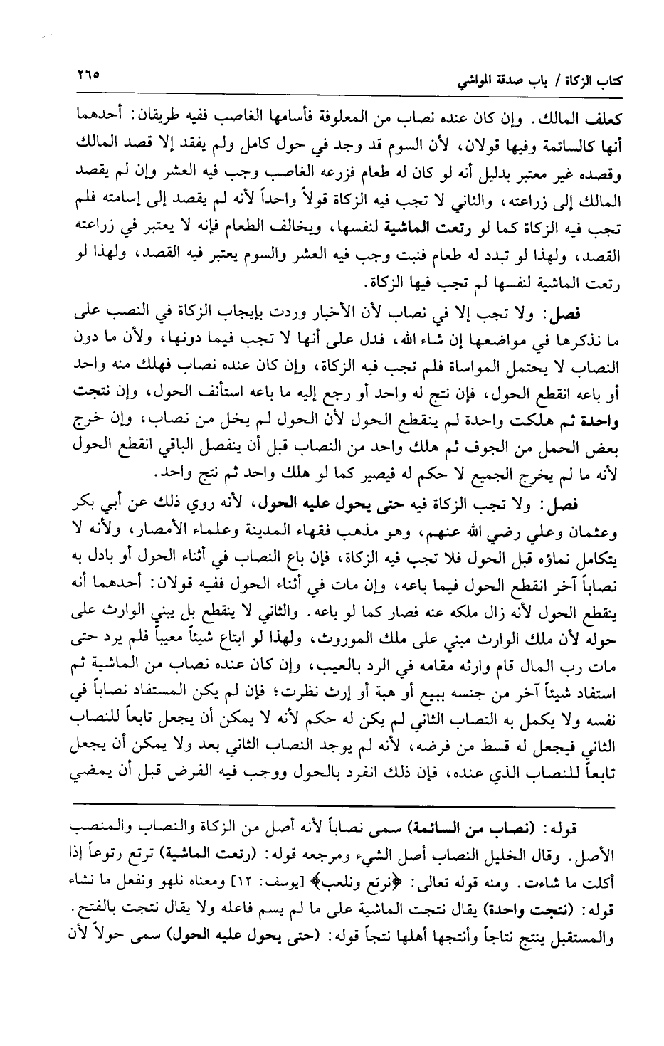 فصل: ولا تجب الزكاة فيه حتى يحول عليه الحول لأنه روي ذلك عن أبي بكر وعثمان وعلي رضي الله عنهم وهو مذهب فقهاء المدينة وعلماء الأمصار ولأنه لا يتكامل نماؤه قبل الحول فلا تجب فيه الزكاة فإن باع النصاب في أثناء الحول أو بادل به نصاباً آخر انقطع الحول فيما باعه وإن مات في أثناء الحول ففيه قولان: أحدهما أنه ينقطع الحول لأنه زال ملكه عنه فصار كما لو باعه والثاني لا ينقطع بل يبني الوارث على حوله لأن ملك الوارث مبني على ملك الموروث ولهذا لو ابتاع شيئاً معيباً فلم يرد حتى مات رب المال قام وارثه مقامه في الرد بالعيب وإن كان عنده نصاب من الماشية ثم استفاد شيئاً آخر من جنسه ببيع أو هبة أو إرث نظرت فإن لم يكن المستفاد نصاباً في نفسه ولا يكمل به النصاب الثاني لم يكن له حكم لأنه لا يمكن أن يجعل تابعاً للنصاب الثاني فيجعل له قسط من فرضه لأنه لم يوجد النصاب الثاني بعد ولا يمكن أن يجعل تابعاً للنصاب الذي عنده فإن ذلك انفرد بالحول ووجب فيه الفرض قبل أن يمضي