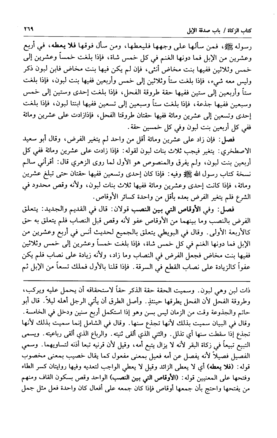 فصل: وفي الأوقاص التي بين النصب قولان: قال في القديم والجديد: يتعلق الفرض بالنصب وما بينهما من الأوقاص عفو لأنه وقص قبل النصاب فلم يتعلق به حق كالأربعة الأولى وقال في البويطي يتعلق بالجميع لحديث أنس في أربع وعشرين من الإبل فما دونها الغنم في كل خمس شاة فإذا بلغت خمساً وعشرين إلى خمس وثلاثين ففيها بنت مخاض فجعل الفرض في النصاب وما زاد ولأنه زيادة على نصاب فلم يكن عفواً كالزيادة على نصاب القطع في السرقة فإذا قلنا بالأول فملك تسعاً من الإبل ثم