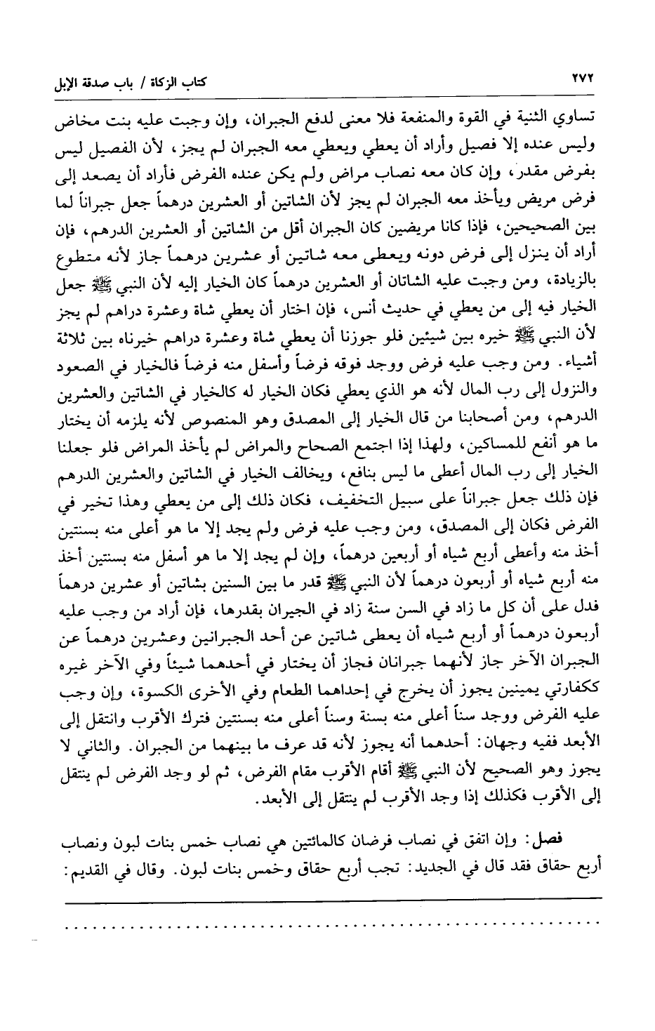 تساوي الثنية في القوة والمنفعة فلا معنى لدفع الجبران وإن وجبت عليه بنت مخاض وليس عنده إلا فصيل وأراد أن يعطي ويعطي معه الجبران لم يجز لأن الفصيل ليس بفرض مقدر وإن كان معه نصاب مراض ولم يكن عنده الفرض فأراد أن يصعد إلى فرض مريض ويأخذ معه الجبران لم يجز لأن الشاتين أو العشرين درهماً جعل جبراناً لما بين الصحيحين فإذا كانا مريضين كان الجبران أقل من الشاتين أو العشرين درهم فإن أراد أن ينزل إلى فرض دونه ويعطى معه شاتين أو عشرين درهماً جاز لأنه متطوع بالزيادة ومن وجبت عليه الشاتان أو العشرين درهماً كان الخيار إليه لأن النبي صلى الله عليه وسلم جعل الخيار فيه إلى من يعطي في حديث أنس فإن اختار أن يعطي شاة وعشرة دراهم لم يجز لأن النبي صلى الله عليه وسلم خيره بين شيئين فلو جوزنا أن يعطي شاة وعشرة دراهم خيرناه بين ثلاثة أشياء من وجب عليه فرض ووجد فوقه فرضاً وأسفل منه فرضاً فالخيار في الصعود والنزول إلى رب المال لأنه هو الذي يعطي فكان الخيار له كالخيار في الشاتين والعشرين الدرهم ومن أصحابنا من قال الخيار إلى المصدق وهو المنصوص لأنه يلزمه أن يختار ما هو أنفع للمساكين ولهذا إذا اجتمع الصحاح والمراض لم يأخذ المراض فلو جعلنا الخيار إلى رب المال أعطى ما ليس بنافع ويخالف الخيار في الشاتين والعشرين الدرهم فإن ذلك جعل جبراناً على سبيل التخفيف فكان ذلك إلى من يعطي وهذا تخير في الفرض فكان إلى المصدق ومن وجب عليه فرض ولم يجد إلا ما هو أعلى منه بسنتين أخذ منه وأعطي أربع شياه أو أربعين درهماً وإن لم يجد إلا ما هو أسفل منه بسنتين أخذ منه أربع شياه أو أربعون درهماً لأن النبي صلى الله عليه وسلم قدر ما بين السنين بشاتين أو عشرين درهماً فدل على أن كل ما زاد في السن زاد في الجيران بقدرها فإن أراد من وجب عليه أربعون درهماً أو أربع شياه أن يعطى شاتين عن أحد الجبرانين وعشرين درهماً عن الجبران الآخر جاز لأنهما جبرانان فجاز أن يختار في أحدهما شيئاً وفي الآخر غيره ككفارتي يمينين يجوز أن يخرج في إحداهما الطعام وفي الأخرى الكسوة وإن وجب عليه الفرض ووجد سناً أعلى منه بسنة وسناً أعلى منه بسنتين فترك الأقرب وانتقل إلى الأبعد ففيه وجهان: أحدهما أنه يجوز لأنه قد عرف ما بينهما من الجبران والثاني لا يجوز وهو الصحيح لأن النبي صلى الله عليه وسلم أقام الأقرب مقام الفرض ثم لو وجد الفرض لم ينتقل إلى الأقرب فكذلك إذا وجد الأقرب لم ينتقل إلى الأبعد.