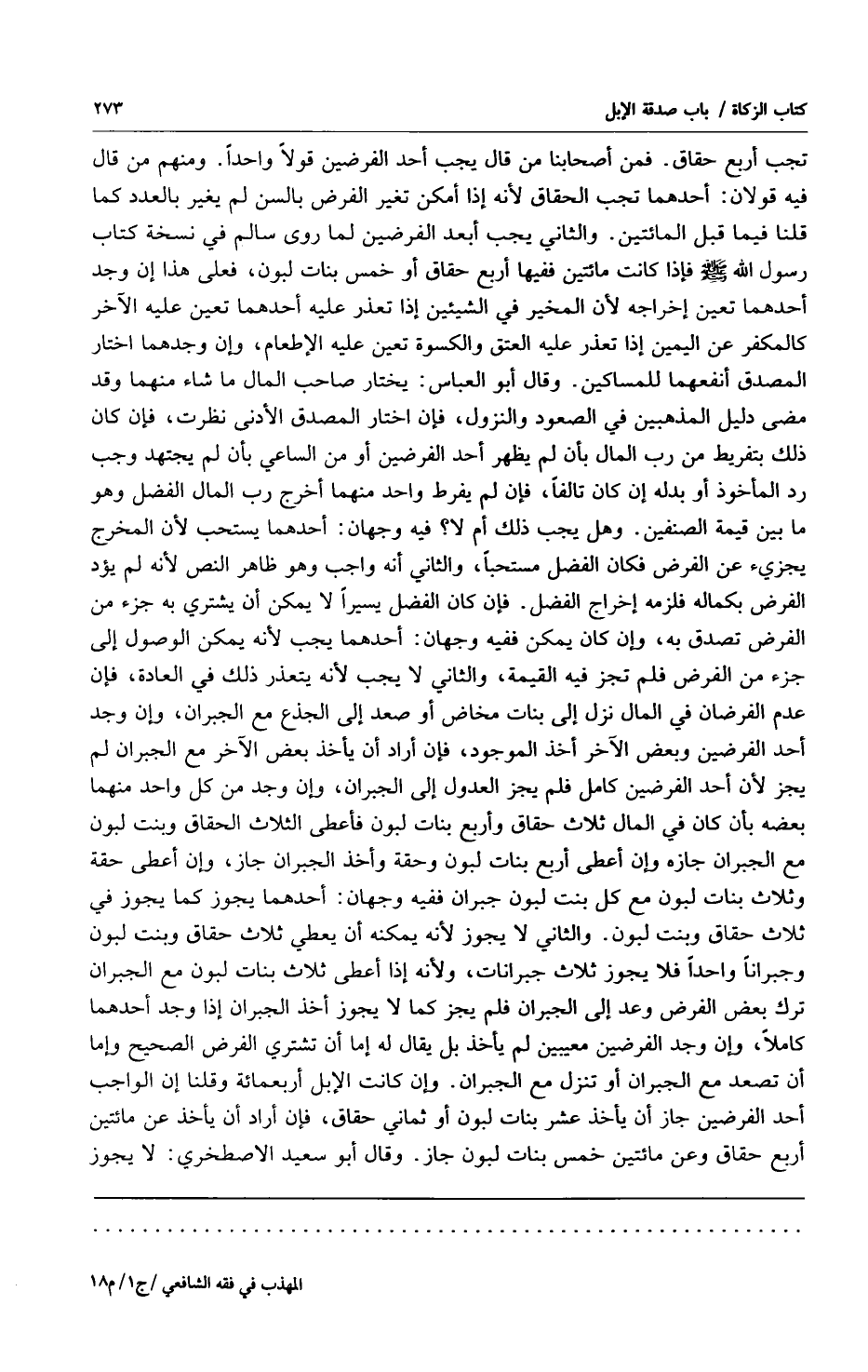 تجب أربع حقاق فمن أصحابنا من قال يجب أحد الفرضين قولاً واحداً ومنهم من قال فيه قولان: أحدهما تجب الحقاق لأنه إذا أمكن تغير الفرض بالسن لم يغير بالعدد كما قلنا فبما قبل المائتين والثاني يجب أبعد الفرضين لما روى سالم في نسخة كتاب رسول الله صلى الله عليه وسلم فإذا كانت مائتين ففيها أربع حقاق أو خمس بنات لبون فعلى هذا إن وجد أحدهما تعين إخراجه لأن المخير في الشيئين إذا تعذر عليه أحدهما تعين عليه الآخر كالمكفر عن اليمين إذا تعذر عليه العتق والكسوة تعين عليه الإطعام وإن وجدهما اختار المصدق أنفعهما للمساكين وقال أبو العباس: يختار صاحب المال ما شاء منهما وقد مضى دليل المذهبين في الصعود والنزول فإن اختار المصدق الأدنى نظرت فإن كان ذلك بتفريط من رب المال بأن لم يظهر أحد الفرضين أو من الساعي بأن لم يجتهد وجب رد المأخوذ أو بدله إن كان تالفاً فإن لم يفرط واحد منهما أخرج رب المال الفضل وهو ما بين قيمة الصنفين وهل يجب ذلك أم لا؟ فيه وجهان: أحدهما يستحب لأن المخرج يجزئ عن الفرض فكان الفضل مستحباً والثاني أنه واجب وهو ظاهر النص لأنه لم يؤد الفرض بكامله فلزمه إخراج الفضل فإن كان الفضل يسيراً لا يمكن أن يشتري به جزء من الفرض تصدق به وإن كان يمكن ففيه وجهان: أحدهما يجب لأنه يمكن الوصول إلى جزء من الفرض فلم تجز فيه القيمة والثاني لا يجب لأنه يتعذر ذلك في العادة فإن عدم الفرضان في المال نزل إلى بنات مخاض أو صعد إلى الجذع مع الجبران وإن وجد أحد الفرضين وبعض الآخر أخذ الموجود فإن أراد أن يأخذ بعض الآخر مع الجبران لم يجز لأن أحد الفرضين كامل فلم يجز العدول إلى الجبران وإن وجد من كل واحد منهما بعضه بأن كان في المال ثلاث حقاق وأربع بنات لبون فأعطى الثلاث الحقاق وبنت لبون مع الجبران جازه وإن أعطى أربع بنات لبون وحقة وأخذ الجبران جاز وإن أعطى حقة وثلاث بنات لبون مع كل بنت لبون جبران ففيه وجهان: أحدهما يجوز كما يجوز في ثلاث حقاق وبنت لبون والثاني لا يجوز لأنه يمكنه أن يعطي ثلاث حقاق وبنت لبون وجبراناً واحداً فلا يجوز ثلاث جبرانات ولأنه إذا أعطى ثلاث بنات لبون مع الجبران ترك بعض الفرض وعد إلى الجبران فلم يجز كما لا يجوز أخذ الجبران إذا وجد أحدهما كاملاً وإن وجد الفرضين معيبين لم يأخذ بل يقال له إما أن تشتري الفرض الصحيح وإما أن تصعد مع الجبران أو تنزل مع الجبران وإن كانت الإبل أربعمائة وقلنا إن الواجب أحد الفرضين جاز أن يأخذ عشر بنات لبون أو ثماني حقاق فإن أراد أن يأخذ عن مائتين أربع حقاق وعن مائتين خمس بنات لبون جاز وقال أبو سعيد الأصطخري: لا يجوز