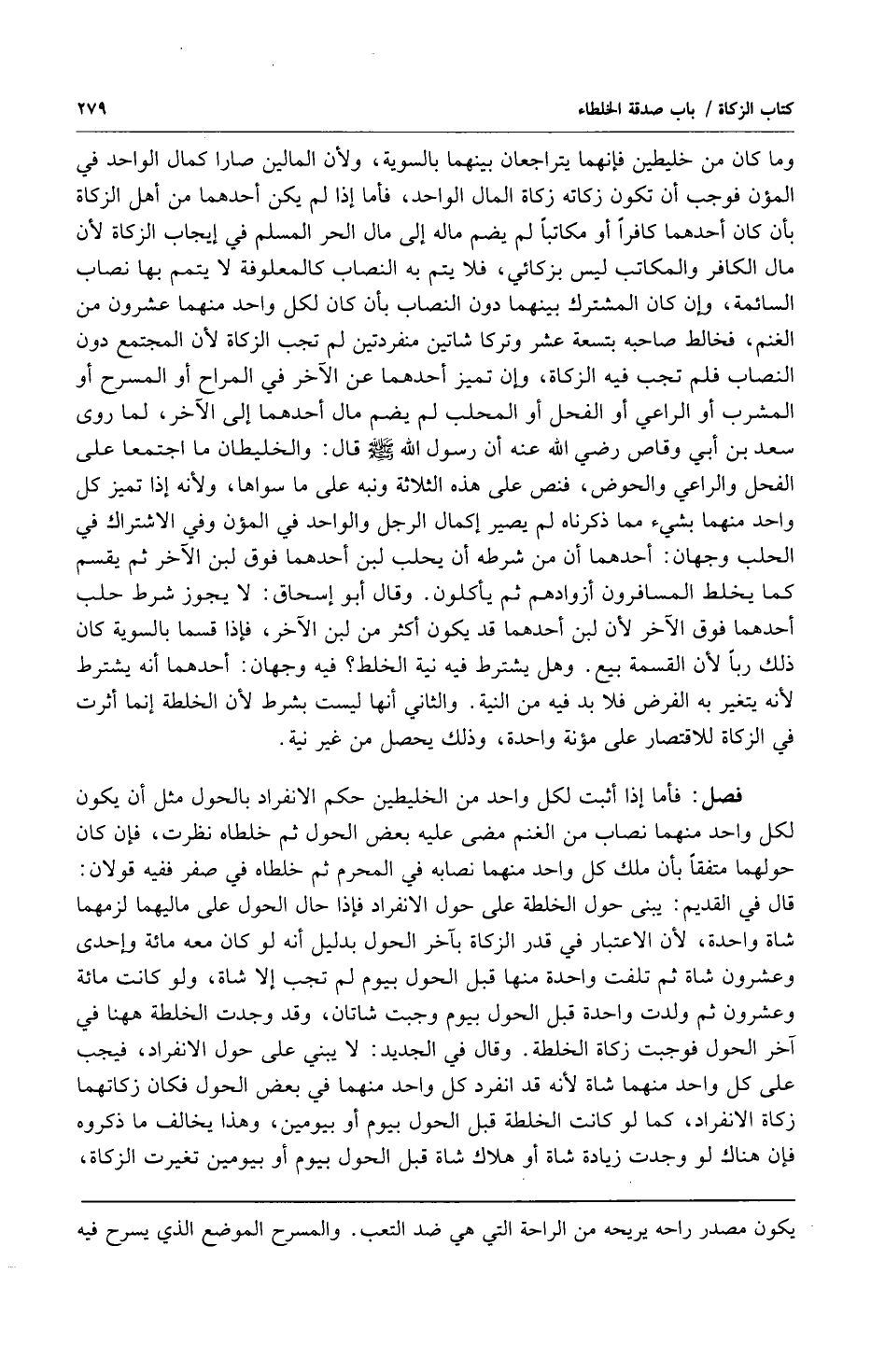 وما كان من خليطين فإنهما يتراجعان بينهما بالسوية ولأن المالين صارا كمال الواحد في المؤن فوجب أن تكون زكاته زكاة المال الواحد فأما إذا لم يكن أحدهما من أهل الزكاة بأن كان أحدهما كافراً أو مكاتباً لم يضم ماله إلى مال الحر المسلم في إيجاب الزكاة لأن مال الكافر والمكاتب ليس بزكائي فلا يتم به النصاب كالمعلوفة لا يتمم بها نصاب السائمة وإن كان المشترك بينهما دون النصاب بأن كان لكل واحد منهما عشرون من الغنم فخالط صاحبه بتسعة عشر وتركا شاتين منفردتين لم تجب الزكاة لأن المجتمع دون النصاب فلم تجب فيه الزكاة وإن تميز أحدهما عن الآخر في المراح أو المسرح أو المشرب أو الراعي أو الفحل أو المحلب لم يضم مال أحدهما إلى الآخر لما روى سعد بن أبي وقاص رضي الله عنه أن رسول الله صلى الله عليه وسلم قال: "والخليطان ما اجتمعا على الفحل والراعي والحوض" فنص على هذه الثلاثة ونبه على ما سواها ولأنه إذا تم تميز كل واحد منهما بشيء مما ذكرناه لم يصير إكمال الرجل الواحد والواحد في المؤن وفي الاشتراك في الحلب وجهان: أحدهما أن من شرطه أن يحلب لبن أحدهما فوق لبن الآخر ثم يقسم كما يخلط المسافرون أزوادهم ثم يأكلون وقال أبو إسحاق: لا يجوز شرط حلب أحدهما فوق الآخر لأن لبن أحدهما قد يكون أكثر من لبن الآخر فإذا قسما بالسوية كان ذلك رباً لأن القسمة بيع وهل يشترط فيه نية الخلط؟ فيه وجهان: أحدهما أنه يشترط لأنه يتغير به الفرض فلا بد فيه من النية والثاني أنها ليست بشرط لأن الخلطة إنما أثرت في الزكاة للاقتصار على مؤنة واحدة وذلك يحصل من غير نية.