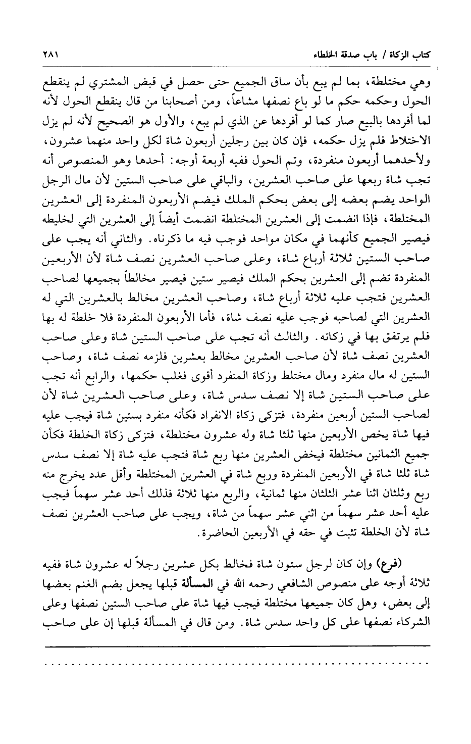 "فرع" وإن كان لرجل ستون شاة فخالط بكل عشرين رجلاً له عشرون شاة ففيه ثلاثة أوجه على منصوص الشافعي رحمه الله في المسألة قبلها يجعل بضم الغنم بعضها إلى بعض وهل كان جميعها مختلطة فيجب فيها شاة على صاحب الستين نصفها وعلى الشركاء نصفها على كل واحد سدس شاة ومن قال في المسألة قبلها إن على صاحب