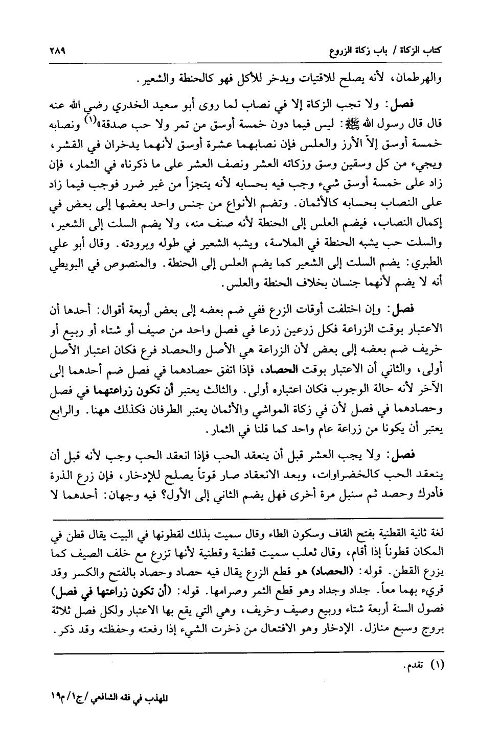 فصل: ولا تجب الزكاة إلا في نصاب لما روى أبو سعيد الخدري رضي الله عنه قال قال رسول الله صلى الله عليه وسلم: "ليس فيما دون خمسة أوسق من تمر ولا حب صدقة1" ونصابه خمسة أوسق إلا الأرز والعلس فإن نصابها عشرة أوسق لأنهما يدخران في القشر ويجيء من كل وسقين وسق وزكاته العشر ونصف العشر على ما ذكرناه في الثمار فإن زاد على خمسة أوسق شيء وجب فيه بحسابه لأنه يتجزأ من غير ضرر فوجب فيما زاد على النصاب بحسابه كالأثمان وتضم النواع من جنس واحد بعضها إلى بعض في إكمال النصاب فيضم العلس إلى الحنطة لأنه صنف منه ولا يضم السلت إلى الشعير والسلت حب يشبه الحنطة في الملامسة ويشبه الشعير في طوله وبرودته وقال أبو علي الطبري: يضم السلت إلى الشعير كما يضم العلس إلى الحنطة والمنصوص في البويطي أنه لا يضم لأنهما جنسان بخلاف الحنطة والعلس.