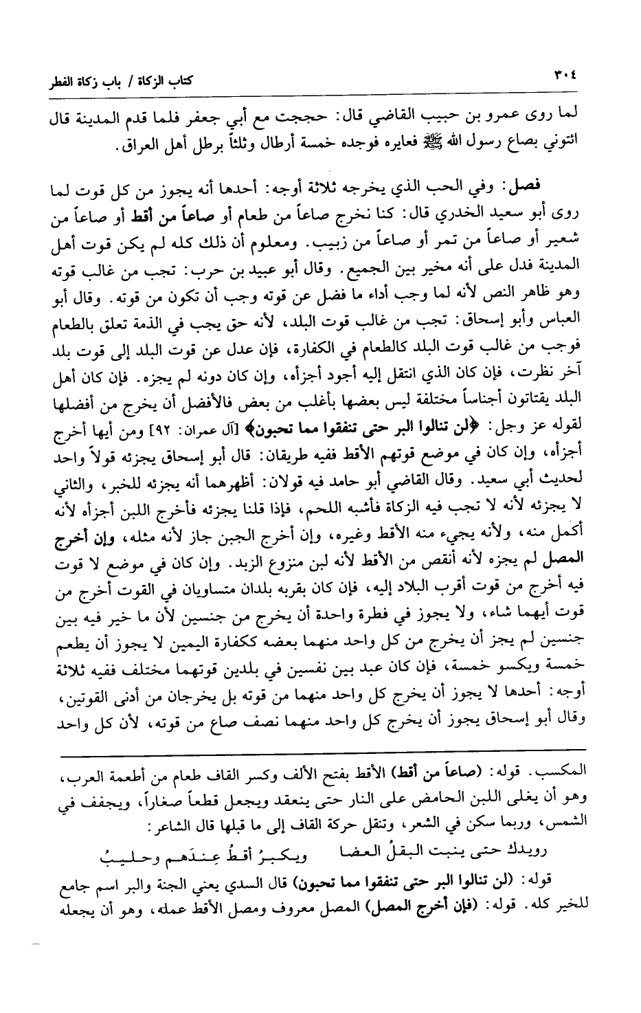 فصل: وفي الحب الذي يخرجه ثلاثة أوجه: أحدها أنه يجوز من كل قوت لما روى أبو سعيد الخدري قال: كنا نخرج صاعاً من طعام أو صاعاً من أقط أو صاعاً من شعير أو صاعاً من تمر أو صاعاً من زبيب ومعلوم أن ذلك كله لم يكن قوت أهل المدينة فدل على أنه مخير بين الجميع وقال أبو عبيد بن حرب: تجب من غالب قوته وهو ظاهر النص لأنه لما وجب أداء ما فضل عن قوته وجب أن تكون من قوته وقال أبو العباس وأبو إسحاق: تجب من غالب قوت البلد لأنه حق يجب في الذمة تعلق بالطعام فوجب من غالب قوت البلد كالطعام في الكفارة فإن عدل عن قوت البلد إلى قوت بلد آخر نظرت فإن كان الذي انتقل إليه أجود أجزأه وإن كان دونه لم يجزه فإن كان أهل البلد يقتاتون أجناساً مختلفة ليس بعضها بأغلب من بعض فالأفضل أن يخرج من أفضلها لقوله عز وجل {لَنْ تَنَالُوا الْبِرَّ حَتَّى تُنْفِقُوا مِمَّا تُحِبُّونَ} [آل عمران:92] ومن أيها أخرج أجزأه وإن كان في موضع قوتهم الأقط ففيه طريقان: قال أبو إسحاق يجزئه قولاً واحداً لحديث أبي سعيد وقال القاضي أبو حامد فيه قولان: أظهرهما أنه يجزئه للخبر والثاني لا يجزئه لأنه لا تجب فيه الزكاة فأشبه اللحم فإذا قلنا يجزئه فأخرج اللبن أجزأه لأنه أكمل منه ولأنه يجيء منه الأقط وغيره وإن أخرج الجبن جاز لأنه مثله وإن أخرج المصل لم يجزه لأنه أنقص من الأقط لأنه لبن منزوع الزبد وإن كان في موضع لا قوت فيه أخرج من قوت أقرب البلاد إليه فإن كان بقربه بلدان متساويان في القوت أخرج من قوت أيهما شاء ولا يجوز في فطرة واحدة أن يخرج من جنسين لأن ما خير فيه بين جنسين لم يجز أن يخرج من كل واحد منهما بعضه ككفارة اليمين لا يجوز أن يطعم خمسة ويكسو خمسة فإن كان عبد بين نفسين في بلدين قوتهما مختلف ففيه ثلاثة أوجه: أحدها لا يجوز أن يخرج كل واحد منهما من قوته بل يخرجان من أدنى القوتين وقال أبو إسحاق يجوز أن يخرج كل واحد منهما نصف صاع من قوته لأن كل واحد