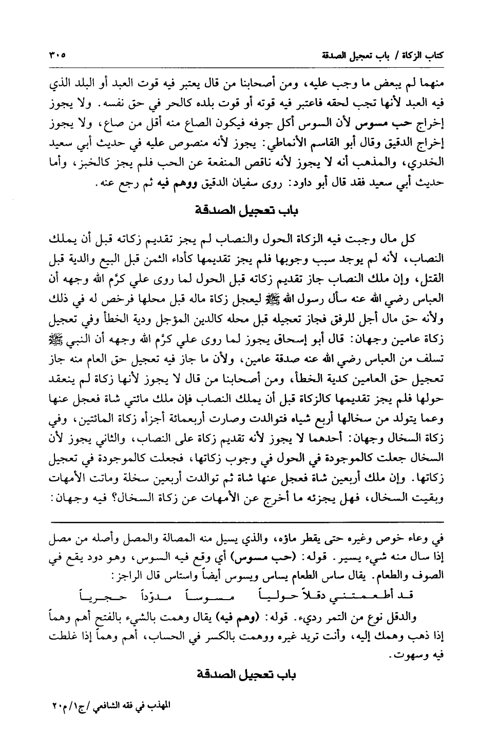 كل مال وجبت فيه الزكاة الحول والنصاب لم يجز تقديم زكاته قبل أن يملك النصاب لأنه لم يوجد سبب وجوبها فلم يجز تقديمها كأداء الثمن قبل البيع والدية قبل القتل وإن ملك النصاب جاز تقديم زكاته قبل الحول لما روى علي كرم الله وجهه أن العباس رضي الله عنه سأل رسول الله صلى الله عليه وسلم ليجعل زكاة ماله قبل محلها فرخص له في ذلك ولأنه حق مال أجل للرفق فجاز تعجيله قبل محله كالدين المؤجل ودية الخطأ وفي تعجيل زكاة عامين وجهان: قال أبو إسحاق يجوز لما روى علي كرم الله وجهه أن النبي صلى الله عليه وسلم تسلف من العباس رضي الله عنه صدقة عامين ولأن ما جاز فيه تعجيل حق العام منه جاز تعجيل حق العامين كدية الخطأ ومن أصحابنا من قال لا يجوز لأنها زكاة لم ينعقد حولها فلم يجز تقديمها كالزكاة قبل أن يملك النصاب فإن ملك مائتي شاة فعجل عنها وعما يتولد من سخالها أربع شياه فتوالدت وصارت أربعمائة أجزأه زكاة المائتين وفي زكاة السخال وجهان: أحدهما لا يجوز لأنه تقديم زكاة على النصاب والثاني يجوز لأن السخال جعلت كالموجودة في الحول في وجوب زكاتها فجعلت كالموجودة في تعجيل زكاتها وإن ملك أربعين شاة فعجل عنها شاة ثم توالدت أربعين سخلة وماتت الأمهات وبقيت السخال فهل يجزئه ما أخرج عن الأمهات عن زكاة السخال؟ فيه وجهان: