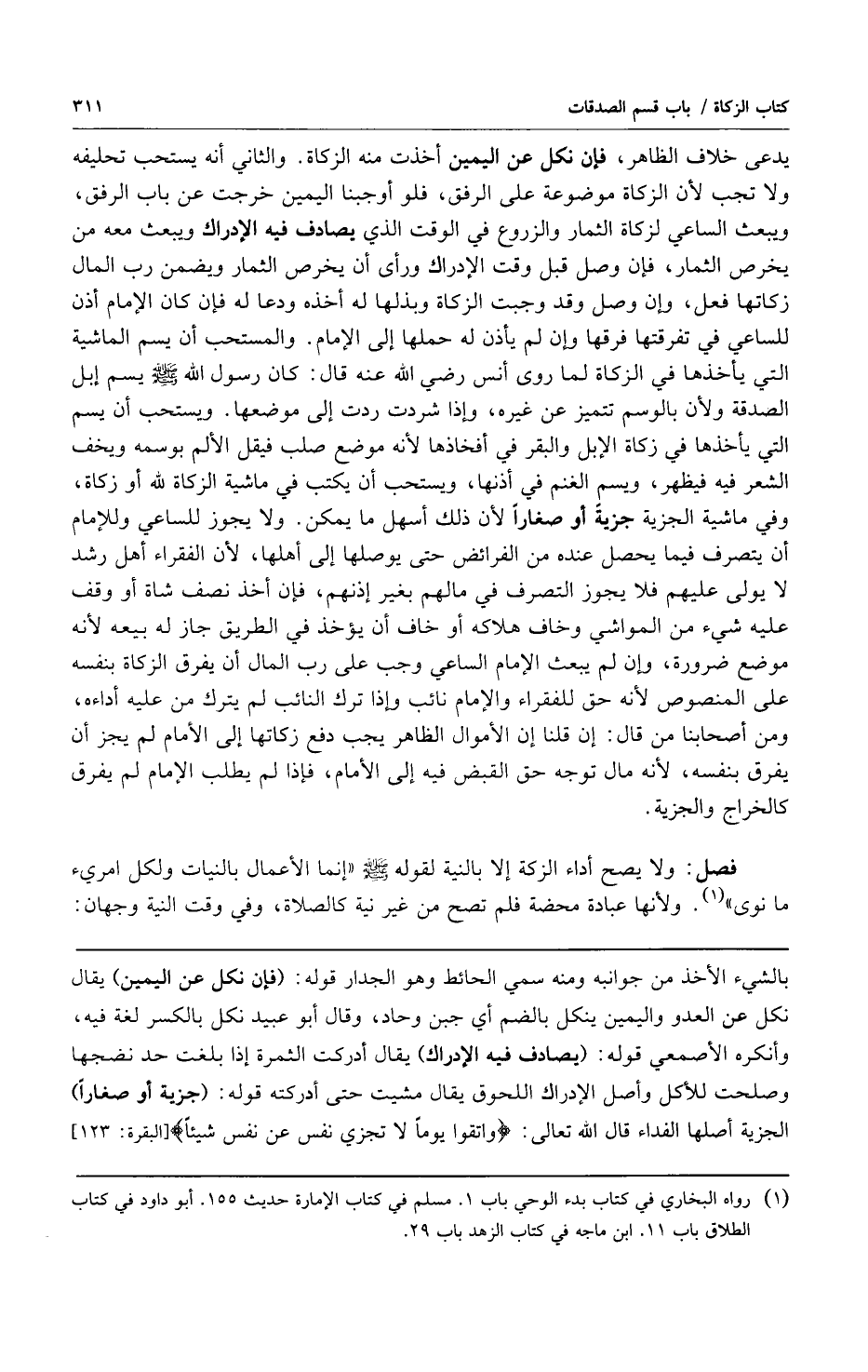 فصل: ولا يصح أداء الزكاة إلا بالنية لقوله صلى الله عليه وسلم "إنما الأعمال بالنيات ولكل امرئ ما نوى1" ولأنها عبادة محضة فلم تصح من غير نية كالصلاة وفي وقت النية وجهان: