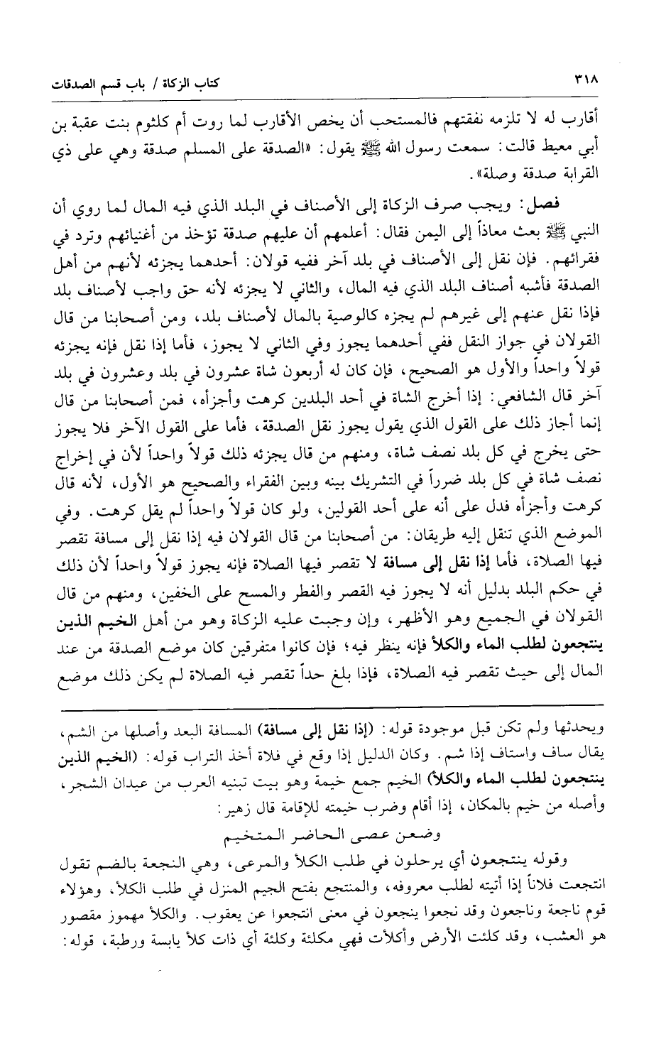 فصل: ويجب صرف الزكاة إلى الأصناف في البلد الذي فيه المال لما روي أن النبي صلى الله عليه وسلم بعث معاذاً إلى اليمن فقال: أعلمهم أن عليهم صدقة تؤخذ من أغنيائهم وترد في فقرائهم فإن نقل إلى الأصناف في بلد آخر ففيه قولان: أحدهما يجزئه لأنهم من أهل الصدقة فأشبه أصناف البلد الذي فيه المال والثاني لا يجزئه لأنه حق واجب لأصناف بلد ومن أصحابنا من قال القولان في جواز النقل ففي أحدهما يجوز وفي الثاني لا يجوز فأما إذا نقل فإنه يجزئه قولاً واحداً والأول هو الصحيح فإن كان له أربعون شاة عشرون في بلد وعشرون في بلد آخر قال الشافعي: إذا أخرج الشاة في أحد البلدين كرهت وأجزأه فمن أصحابنا من قال إنما أجاز ذلك على القول الذي يقول يجوز نقل الصدقة فأما على القول الآخر فلا يجوز حتى يخرج في كل بلد نصف شاة ومنهم من قال يجزئه ذلك قولاً واحداً لأن في إخراج نصف الشاة في كل بلد ضرراً في التشريك بينه وبين الفقراء والصحيح هو الأول لأنه قال كرهت وأجزأه فدل على أنه أحد القولين ولو كان قولاً واحداً لم يقل كرهت وفي الموضع الذي تنقل إليه طريقان: من أصحابنا من قال القولان فيه إذا نقل إلى مسافة تقصر فيها الصلاة فأما إذا نقل إلى مسافة لا تقصر فيها الصلاة فإنه يجوز قولاً واحداً لأن ذلك في حكم البلد بدليل أنه لا يجوز فيه القصر والفطر والمسح على الخفين ومنهم من قال القولان في الجميع وهو الأظهر وإن وجبت عليه الزكاة وهو من أهل الخيم الذين ينتجعون لطلب الماء والكلأ فإنه ينظر فيه فإن كانوا متفرقين كان موضع الصدقة من عند المال إلى حيث تقصر فيه الصلاة فإذا بلغ حداً تقصر فيه الصلاة لم يكن ذلك موضع