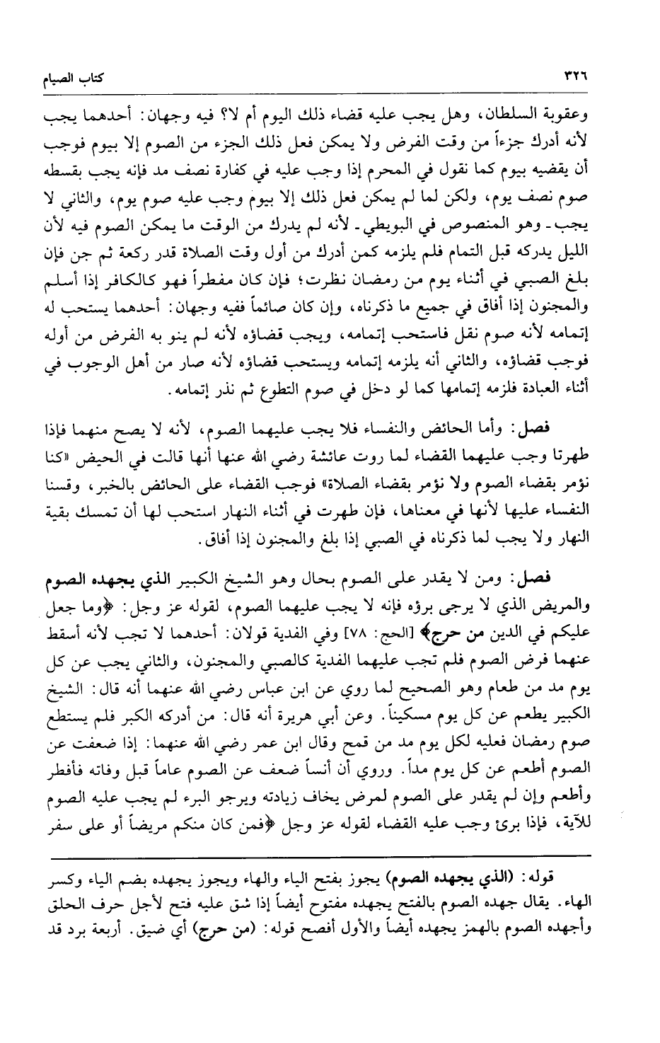 وعقوبة السلطان وهل يجب عليه قضاء ذلك اليوم أم لا؟ فيه وجهان: أحدهما يجب لأنه أدرك جزءاً من وقت الفرض ولا يمكن فعل ذلك الجزء من الصوم إلا بيوم فوجب أن يقضيه بيوم كامل كما نقول في المحرم إذا وجب عليه في كفارة نصف مد فإنه يجب بقسطه صوم نصف يوم ولكن لما لم يمكن فعل ذلك إلا بيوم وجب عليه صوم يوم والثاني لا يجب ـ وهو المنصوص في البويطي ـ لأنه لم يدرك من الوقت ما يمكن الصوم فيه لأن الليل يدركه قبل التمام فلم يلزمه كمن أدرك من أول وقت الصلاة قدر الركعة ثم جن فإن بلغ الصبي في أثناء يوم من رمضان نظرت فإن كان مفطراً فهو كالكافر إذا أسلم والمجنون إذا أفاق في جميع ما ذكرناه وإن كان صائماً ففيه وجهان: أحدهما يستحب له إتمامه لأنه صوم نقل فاستجب إتمامه ويجب قضاؤه لأنه لم ينو به الفرض من أوله فوجب قضاؤه والثاني أنه يلزمه إتمامه ويستحب قضاؤه لأنه صار من أهل الوجوب في أثناء العبادة فلزمه إتمامها كما لو دخل في صوم التطوع ثم نذر إتمامه.