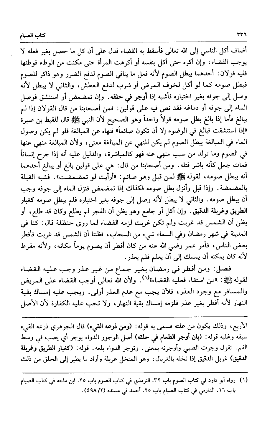 فصل: ومن أفطر في رمضان بغير جماع من غير عذر وجب عليه القضاء لقوله صلى الله عليه وسلم: "من استقاء فعليه القضاء1" ولأن الله تعالى أوجب القضاء على المريض والمسافر مع وجود العذر فلأن يجب مع عدم العذر أولى ويجب عليه إمساك بقية النهار لأنه أفطر بغير عذر فلزمه إمساك بقية النهار ولا تجب عليه الكفارة لأن الأصل
