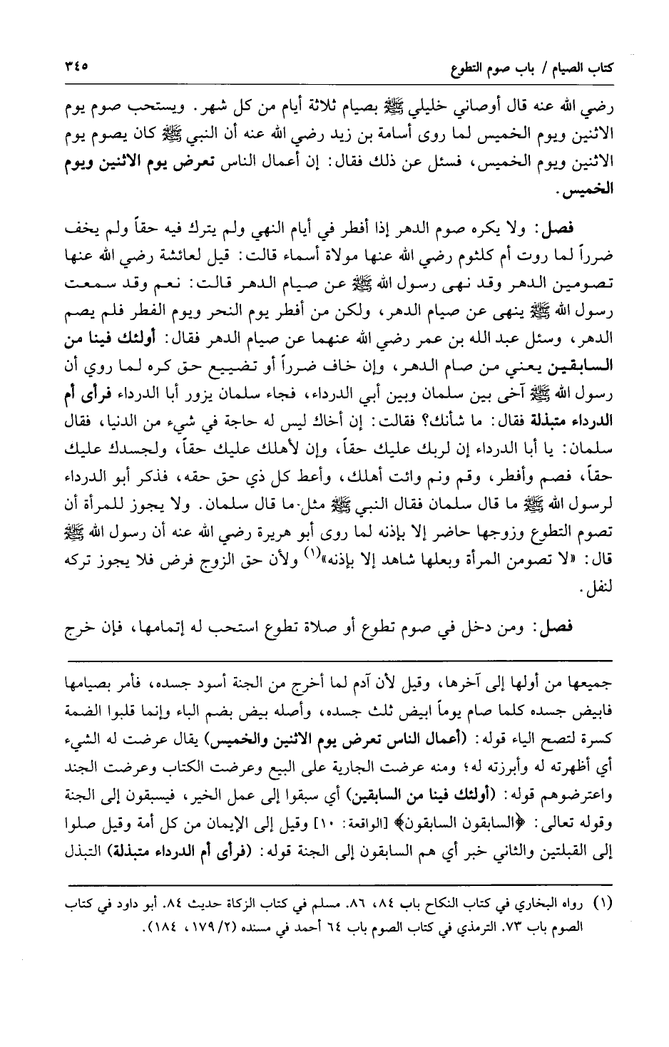 فصل: ولا يكره صوم الدهر إذا أفطر في أيام النهي ولم يترك فيه حقاً ولم يخف ضرراً لما روت أم كلثوم رضي الله عنها مولاة أسماء قالت: قيل لعائشة رضي الله عنها تصومين الدهر وقد نهى رسول الله صلى الله عليه وسلم عن صيام الدهر قالت: نعم وقد سمعت رسول الله صلى الله عليه وسلم ينهى عن صيام الدهر ولكن من أفطر يوم النحر ويوم الفطر فلم يصم الدهر وسئل عبد الله بن عمر رضي الله عنهما عن صيام الدهر فقال: أولئك فينا من السابقين يعني من صام الدهر وإن خاف ضرراً أو تضييع حق كره لما روي أن رسول الله صلى الله عليه وسلم آخى بين سلمان وبين أبي الدرداء فجاء سلمان يزور أبا الدرداء فرأى أم الدرداء متبذلة فقال: ما شأنك؟ فقالت: إن أخاك ليس له حاجة في شيء من الدنيا فقال سلمان: يا أباالدرداء إن لربك عليك حقاً وإن لأهلك عليك حقاً ولجسدك عليك حقاً فصم وأفطر وقم ونم وائت أهلك وأعط كل ذي حق حقه فذكر أبو الدرداء لرسول الله ما قال سلمان فقال النبي صلى الله عليه وسلم مثل ما قال سلمان ولا يجوز للمرأة أن تصوم التطوع وزوجها حاضر إلا بإذنه لما روى أبو هريرة رضي الله عنه أن رسول الله صلى الله عليه وسلم قال: "لا تصومن المرأة وبعلها شاهد إلا بإذنه1" ولأن حق الزوج فرض فلا يجوز تركه لنفل.