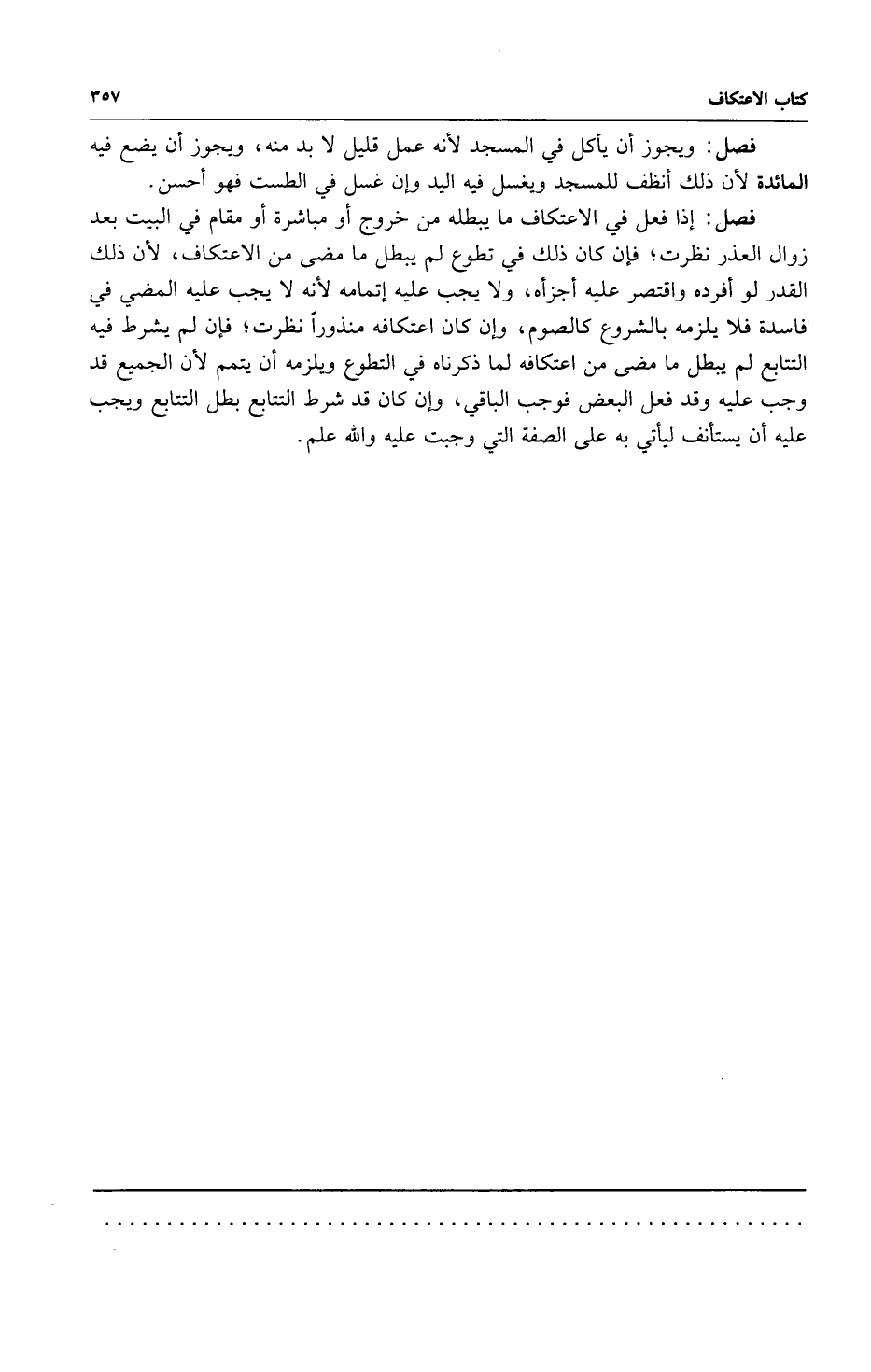 فصل: إذا فعل في الاعتكاف ما يبطله من خروج أو مباشرة أو مقام في البيت بعد زوال العذر نظرت فإن كان ذلك في تطوع لم يبطل ما مضى من الاعتكاف لأن ذلك القدر لو أفرده واقتصر عليه أجزأه ولا يجب عليه إتمامه لأنه لا يجب عليه المضي في فاسدة فلا يلزمه بالشروع كالصوم وإن كان اعتكافه منذوراً نظرت فإن لم يشرط فيه التتابع لم يبطل ما مضى من اعتكافه لما ذكرناه في التطوع ويلزمه أن يتمم لأن الجميع قد وجب عليه وقد فعل البعض فوجب الباقي وإن كان قد شرط التتابع بطل التتابع ويجب عليه أن يستأنف ليأتي به على الصفة التي وجبت عليه والله أعلم.