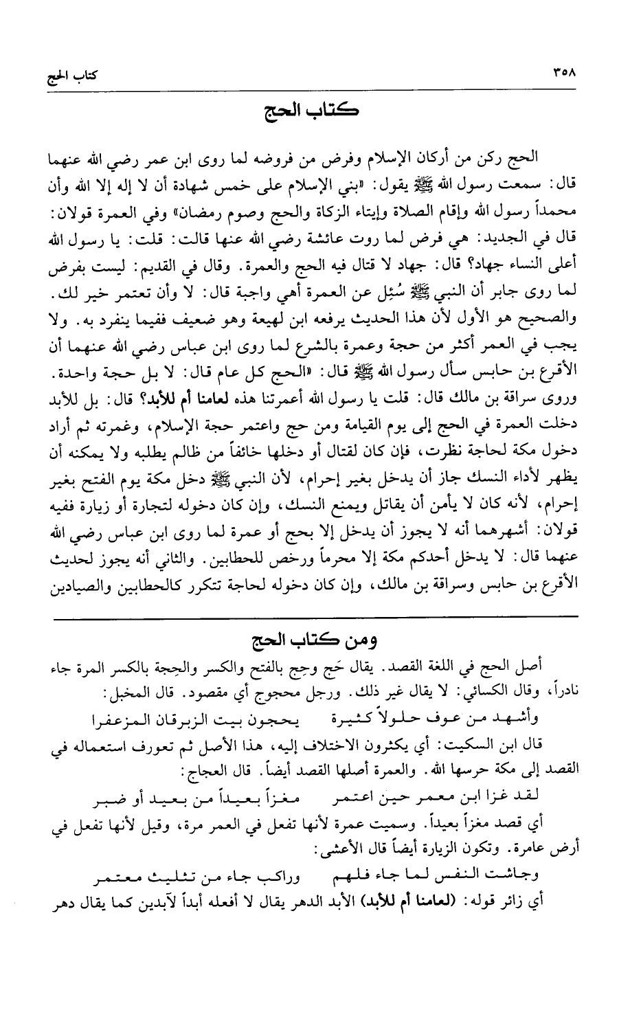 الحج ركن من أركان الإسلام وفرض من فروضه لما روى ابن عمر رضي الله عنهما قال سمعت رسول الله صلى الله عليه وسلم يقول: "بني الإسلام على خمس شهادة أن لا إله إلا الله وأن محمداً رسول الله صلى الله عليه وسلم وإقام الصلاة وإيتاء الزكاة والحج وصوم رمضان" وفي العمرة قولان: قال في الجديد: هي فرض لما روت عائشة رضي الله عنها قالت: قلت: يا رسول الله أعلى النساء جهاد؟ قال: جهاد لا قتال فيه الحج والعمرة وقال في القديم: ليست بفرض لما روى جابر أن النبي صلى الله عليه وسلم سئل عن العمرة أهي واجبة قال: لا وأن تعتمر خير لك والصحيح هو الأول لأن هذا الحديث يرفعه ابن لهيعة وهو ضعيف ففيما ينفرد به ولا يجب في العمر أكثر من حجة وعمرة بالشرع لما روى ابن عباس رضي الله عنهما أن الأقرع بن حابس سأل رسول الله صلى الله عليه وسلم قال: الحج كل عام قال: "لا بل حجة واحدة" وروى سراقة بن مالك قال: قلت يا رسول الله أعمرتنا هذه لعامنا أم للأبد؟ قال: بل للأبد دخلت العمرة في الحج إلى يوم القيامة ومن حج واعتمر حجة الإسلام وغمرته ثم أراد دخول مكة لحاجة نظرت فإن كان لقتال أو دخلها خائفاً من ظالم يطلبه ولا يمكنه أن يظهر لأداء النسك جاز أن يدخل بغير إحرام لأن النبي صلى الله عليه وسلم دخل مكة يوم الفتح بغير إحرام لأنه كان لا يأمن أن يقاتل ويمنع النسك وإن كان دخوله لتجارة أو زيارة ففيه قولان: أشهرهما أنه لا يجوز أن يدخل إلا بحج أو عمرة لما روى ابن عباس رضي الله عنهما قال: لا يدخل أحدكم مكة إلا محرماً ورخص للحطابين والثاني أنه يجوز لحديث الأقرع بن حابس وسراقة بن مالك وإن كان دخوله لحاجة تتكرر كالحطابين والصيادين