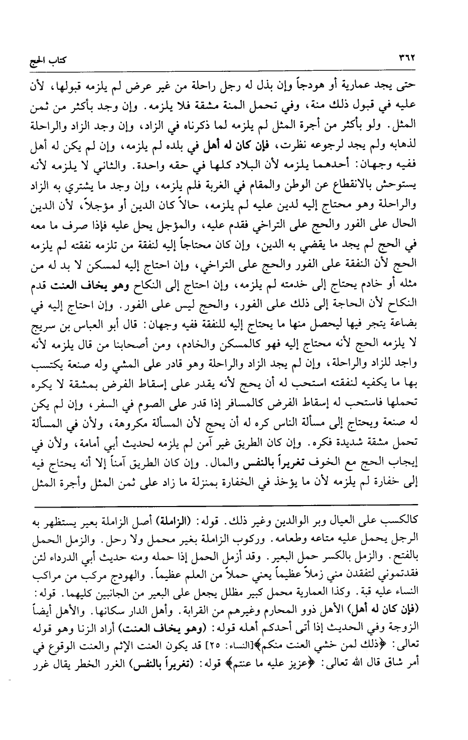 حتى يجد عمارية أو هودجاً وإن بذل له رجل راحلة من غير عرض لم يلزمه قبولها لأن عليه في قبول ذلك منة وفي تحمل المنة مشقة فلا يلزمه وإن وجد بأكثر من ثمن المثل ولو بأكثر من أجرة المثل لم يلزمه لما ذكرناه في الزاد وإن وجد الزاد والراحلة لذهابه ولم يجد لرجوعه نظرت فإن كان له أهل في بلده لم يلزمه وإن لم يكن له أهل ففيه وجهان: أحدهما يلزمه لأن البلاد كلها في حقه واحدة والثاني لا يلزمه لأنه يستوحش بالانقطاع عن الوطن والمقام في الغربة لم يلزمه وإن وجد ما يشتري به الزاد والراحلة وهو محتاج إليه لدين عليه لم يلزمه حالاً كان الدين أو مؤجلاً لأن الدين الحال على الفور والحج على التراخي فقدم عليه والمؤجل يحل عليه فإذا صرف ما معه في الحج لم يجد ما يقضي به الدين وإن كان محتاجاً إليه لنفقة من تلزمه نفقة لم يلزمه الحج لأن النفقة على الفور والحج على التراخي وإن احتاج إليه لمسكن لا بد له من مثله أو خادم يحتاج إلى خدمته لم يلزمه وإن احتاج إلى النكاح وهو يخاف العنت قدم النكاح لأن الحاجة إلى ذلك الفور والحج ليس على الفور وإن احتاج إليه في بضاعة يتجر فيهل ليحصل منها على ما يحتاج إليه للنفقة ففيه وجهان: قال أبو العباس بن سريج لا يلزمه الحج أنه محتاج إليه فهو كالمسكن والخادم ومن أصحابنا من قال يلزمه لأنه واجد للزاد والراحلة وإن لم يجد الزاد والراحلة وهو قادر على المشي وله صنعة يكتسب بها ما يكفيه لنفقته استحب له أن يحج لأنه يقدر على إسقاط الفرض بمشقة لا يكره تحملها فاستحب له إسقاط الفرض كالمسافر إذا قدر على الصوم في السفر وإن لم يكن له صنعة ويحتاج إلى مسألة الناس كره له أن يحج لأن المسألة مكروهة ولأن في المسألة تحمل مشقة شديدة فكره وإن كان الطريق غير آمن لم يلزمه لحديث أبي أمامة ولأن في إيجاب الحج مع الخوف تغريراً بالنفس والمال وإن كان الطريق آمناً إلا أنه يحتاج فيه إلى خفارة لم يلزمه لأن ما يؤخذ في الخفارة بمنزلة ما زاد على ثمن المثل وأجرة المثل