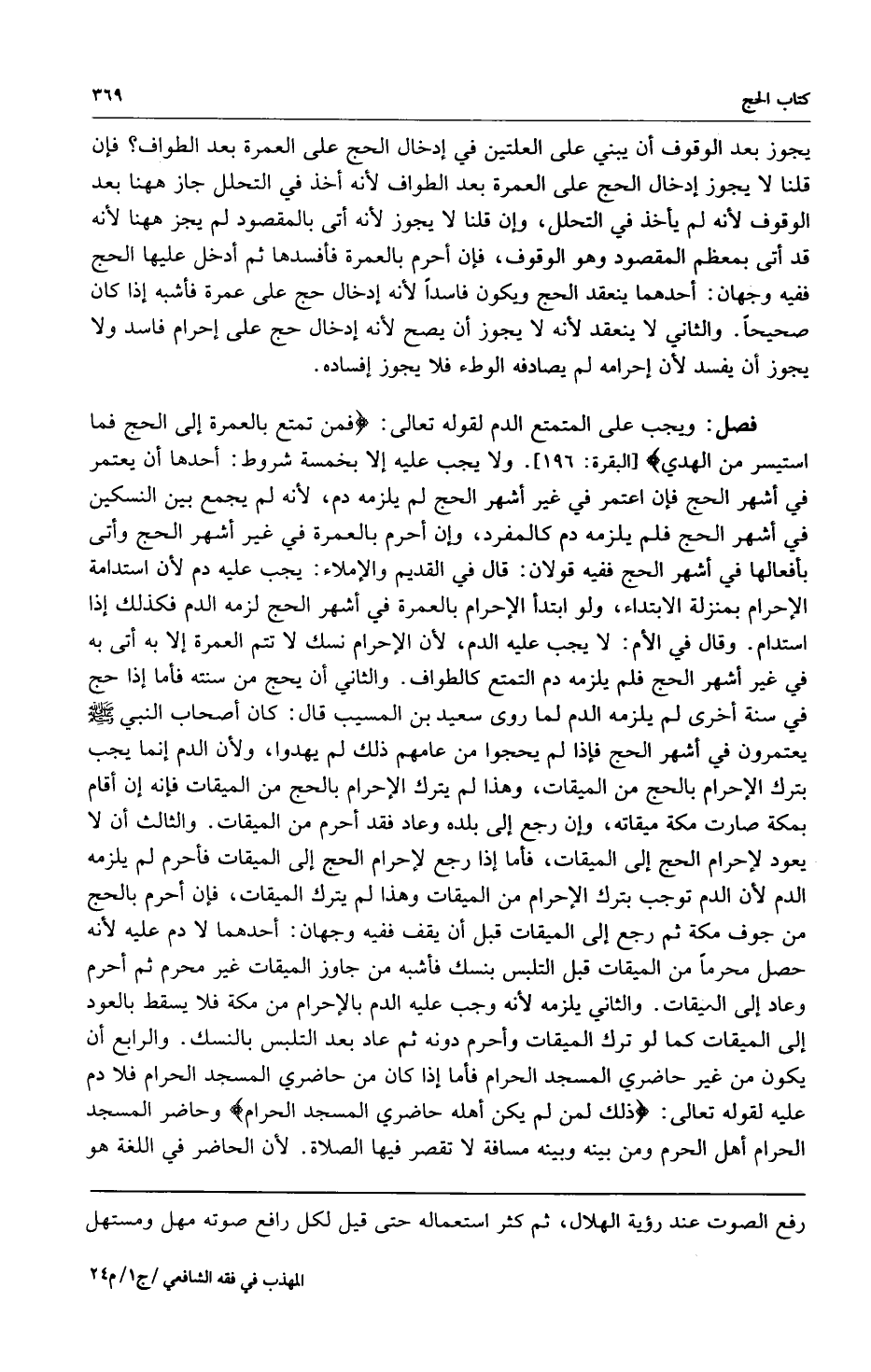 فصل: ويجب على المتمتع الدم لقوله تعالى: {فَمَنْ تَمَتَّعَ بِالْعُمْرَةِ إِلَى الْحَجِّ فَمَا اسْتَيْسَرَ مِنَ الْهَدْيِ} [البقرة:196] ولا يجب عليه إلا بخمسة شروط: أحدها أن يعتمر في أشهر الحج فإن اعتمر في غير أشهر الحج لم يلزمه دم لأنه لم يجمع بين النسكين في أشهر الحج فلم يلزمه دم كالمفرد وإن أحرم بالعمرة في غير أشهر الحج وأتى بأفعالها في أشهر الحج ففيه قولان: قال في القديم والإملاء: يجب عليه دم لأن استدامة الإحرام بمنزلة الابتداء ولو ابتدأ الإحرام بالعمرة في أشهر الحج لزمه الدم فكذلك إذا استدام وقال في الأم: لا يجب عليه الدم لأن الإحرام نسك لا تتم العمرة إلا به أتى به في غير أشهر الحج فلم يلزمه دم التمتع كالطواف والثاني أن يحج من سنته فأما إذا حج في سنة اخرى لم يلزمه الدم لما روى سعيد بن المسيب قال: كان أصحاب النبي صلى الله عليه وسلم يعتمرون في أشهر الحج فإذا لم يحجوا من عامهم ذلك لم يهدوا ولأن الدم إنما يجب بترك الإحرام بالحج من الميقات وهذا لم يترك الإحرام بالحج من الميقات فإنه إن أقام بمكة صارت مكة ميقاته وإن رجع إلى بلده وعاد فقد أحرم من الميقات والثالث أن لا يعود لإحرام إلى الميقات فأما إذا رجع لإحرام الحج إلى الميقات فأحرم لم يلزمه الدم لأن الدم توجب بترك الإحرام من الميقات وهذا لم يترك الميقات فإن أحرم بالحج من جوف مكة ثم رجع إلى الميقات قبل أن يقف ففيه وجهان: أحدهما لا دم عليه لأنه حصل محرماً من الميقات قبل التلبس بنسك فأشبه من جاوز الميقات غير محرم ثم أحرم وعاد إلى الميقات والثاني يلزمه لأنه وجب عليه الدم بالإحرام من مكة فلا يسقط بالعود إلى الميقات كما لو ترك الميقات وأحرم دونه ثم عاد بعد التلبس بالنسك والرابع أن يكون من غير حاضري المسجد الحرام فأما إذا كان من حاضري المسجد الحرام فلا دم عليه لقوله تعالى: {ذَلِكَ لِمَنْ لَمْ يَكُنْ أَهْلُهُ حَاضِرِي الْمَسْجِدِ الْحَرَامِ} وحاضر المسجد الحرام أهل الحرم ومن بينه وبينه مسافة لا تقصر فيها الصلاة لأن الحاضر في اللغة هو