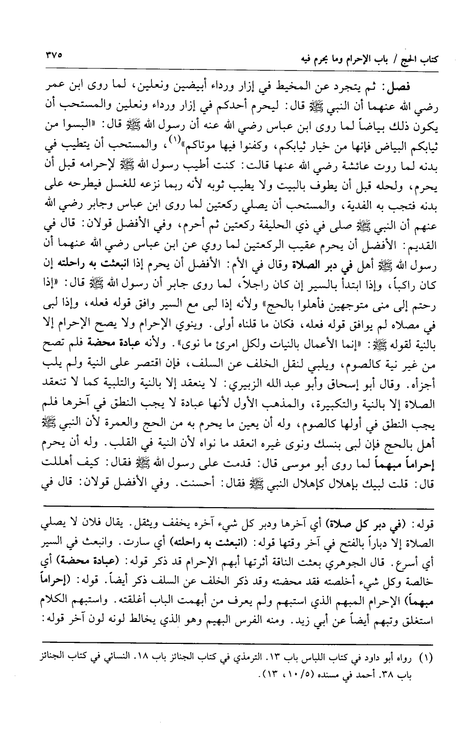 فصل: ثم يتجرد عن المخيط في إزار ورداء أبيضين ونعلين لما روى بن عمر رضي الله عنهما أن النبي صلى الله عليه وسلم قال: ليحرم أحدكم في إزار ورداء ونعلين والمستحب أن يكون ذلك بياضاً لما روى ابن عباس رضي الله عنه أن رسول الله صلى الله عليه وسلم قال: "البسوا من ثيابكم البياض فإنها من خيار ثيابكم وكفنوا فيها موتاكم1" والمستحب أن يتطيب في بدنه لما روت عائشة رضي الله عنها قالت: كنت أطيب رسول الله صلى الله عليه وسلم لإحرامه قبل أن يحرم ولحله قبل أن يطوف بالبيت ولا يطيب ثوبه لأنه ربما نزعه للغسل فيطرحه على بدنه فتجب به الفدية والمستحب أن يصلي ركعتين لما روى ابن عباس وجابر رضي الله عنهم أن النبي صلى الله عليه وسلم صلى في ذي الحليفة ركعتين ثم أحرم وفي الأفضل قولان: قال في القديم: الأفضل أن يحرم عقيب الركعتين لما روي عن ابن عباس رضي الله عنهما أن رسول الله صلى الله عليه وسلم أهل في دبر الصلاة وقال في الأم: الأفضل أن يحرم إذا انبعث به راحلته إن كان راكباً وإذا ابتدأ بالسير إن كان راجلاً لما روى جابر أن رسول الله صلى الله عليه وسلم قال: "إذا رحتم إلى منى متوجهين فأهلوا بالحج" ولأنه إذا لبى مع السير وافق قوله فعله وإذا لبى في مصلاه لم يوافق فعله فكان ما قلناه أولى وينوي الإحرام ولا يصح الإحرام إلا بالنية لقوله صلى الله عليه وسلم: "إنما الأعمال بالنيات ولكل امرئ ما نوى" ولأنه عبادة محضة فلم تصح من غير نية كالصوم ويلبي لنقل الخلف عن السلف فإن اقتصر على النية ولم يلب أجزأه وقال أبو إسحاق وأبو عبد الله الزبيري: لا ينعقد إلا بالنية والتلبية كما لا تنعقد الصلاة إلا بالنية والتكبيرة والمذهب الأول لأنها عبادة لا يجب النطق في آخرها فلم يجب النطق في أولها كالصوم وله أن يعين ما يحرم به من الحج والعمرة لأن النبي صلى الله عليه وسلم أهل بالحج فإن لبى بنسك ونوى غيره انعقد ما نواه لأن النية في القلب وله أن يحرم إحراماً مبهماً لما روى أبو موسى قال: قدمت على رسول الله صلى الله عليه وسلم فقال: كيف أهللت قال: قلت لبيك بإهلال كإهلال النبي صلى الله عليه وسلم فقال: أحسنت وفي الأفضل قولان: قال في