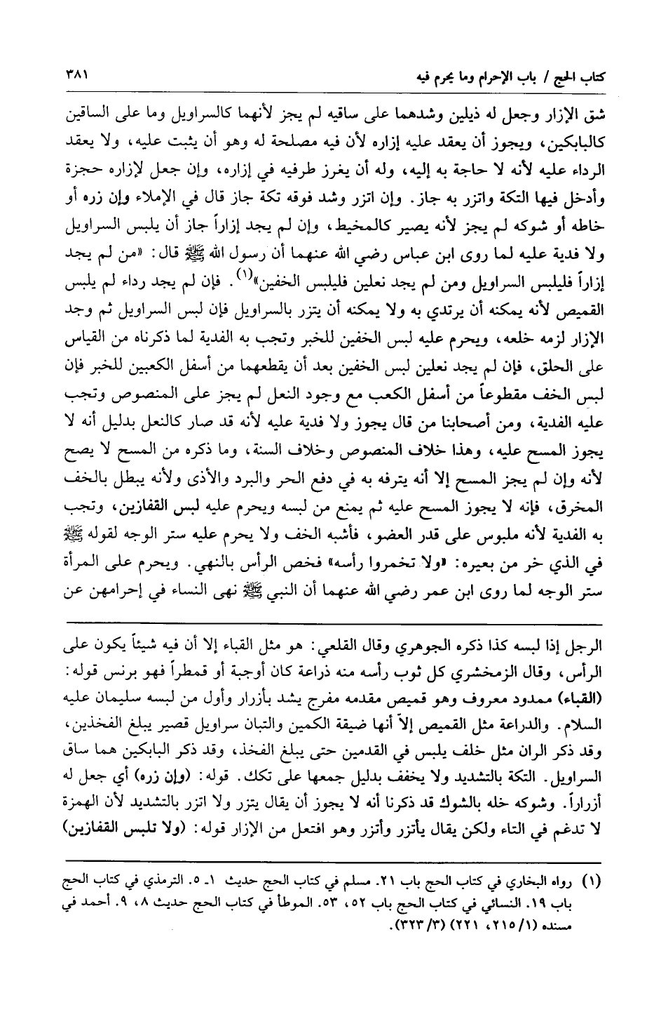 شق الإزار وجعل له ذيلين وشدهما على ساقيه لم يجز لأنهما كالسراويل وما على الساقين كالبابكين ويجوز أن يعقد عليه إزاره لأن فيه مصلحة له وهو أن يثبت عيه ولا يعقد الرداء عليه لأنه لا حاجة به إليه وله أن يغرز طرفيه في إزاره وإن جعل لإزاره حجزة وأدخل فيها التكة واتزر به جاز وإن اتزر وشد فوقه تكة جاز قال في الإملاء وإن زره أو خاطه أو شوكه لم يجز لأنه يصير كالمخيط وإن لم يجد إزاراً جاز أن يلبس السراويل ولا فدية عليه لما روى ابن عباس رضي الله عنهما أن رسول الله صلى الله عليه وسلم قال: "من لم يجد إزاراً فليلبس السراويل ومن لم يجد نعلين فليلبس الخفين1" فإن لم يجد رداء لم يلبس القميص لأنه يمكنه أن يرتدي به ولا يمكنه أن يتزر بالسراويل فإن لبس السراويل ثم وجد الإزار لزمه خلعه ويحرم عليه لبس الخفين للخبر وتجب الفدية لما ذكرناه من القياس على الحلق فإن لم يجد نعلين لبس الخفين بعد أن يقطعهما من أسفل الكعبين للخبر فإن لبس الخف مقطوعاً من أسفل الكعب مع وجود النعل لم يجز على المنصوص وتجب عليه الفدية ومن أصحابنا من قال يجوز ولا فدية عليه لأنه قد صار كالنعل بدليل أنه لا يجوز المسح عليه وهذا خلاف المنصوص وخلاف السنة وما ذكره من المسح لا يصح لأنه وإن لم يجز المسح إلا أنه يترفه به في دفع الحر والبرد والأذى ولأنه يبطل بالخف المخرق فإنه لا يجوز المسح عليه ثم يمنع من لبسه ويحرم عليه لبس القفازين وتجب به الفدية لأنه ملبوس على قدر العضو فأشبه الخف ولا يحرم عليه ستر الوجه لقوله صلى الله عليه وسلم في الذي خر من بعيره: "ولا تخمروا رأسه" فخص الرأس بالنهي ويحرم على المرأة ستر الوجه لما روى ابن عمر رضي الله عنهما أن النبي صلى الله عليه وسلم نهى النساء في إحرامهن عن