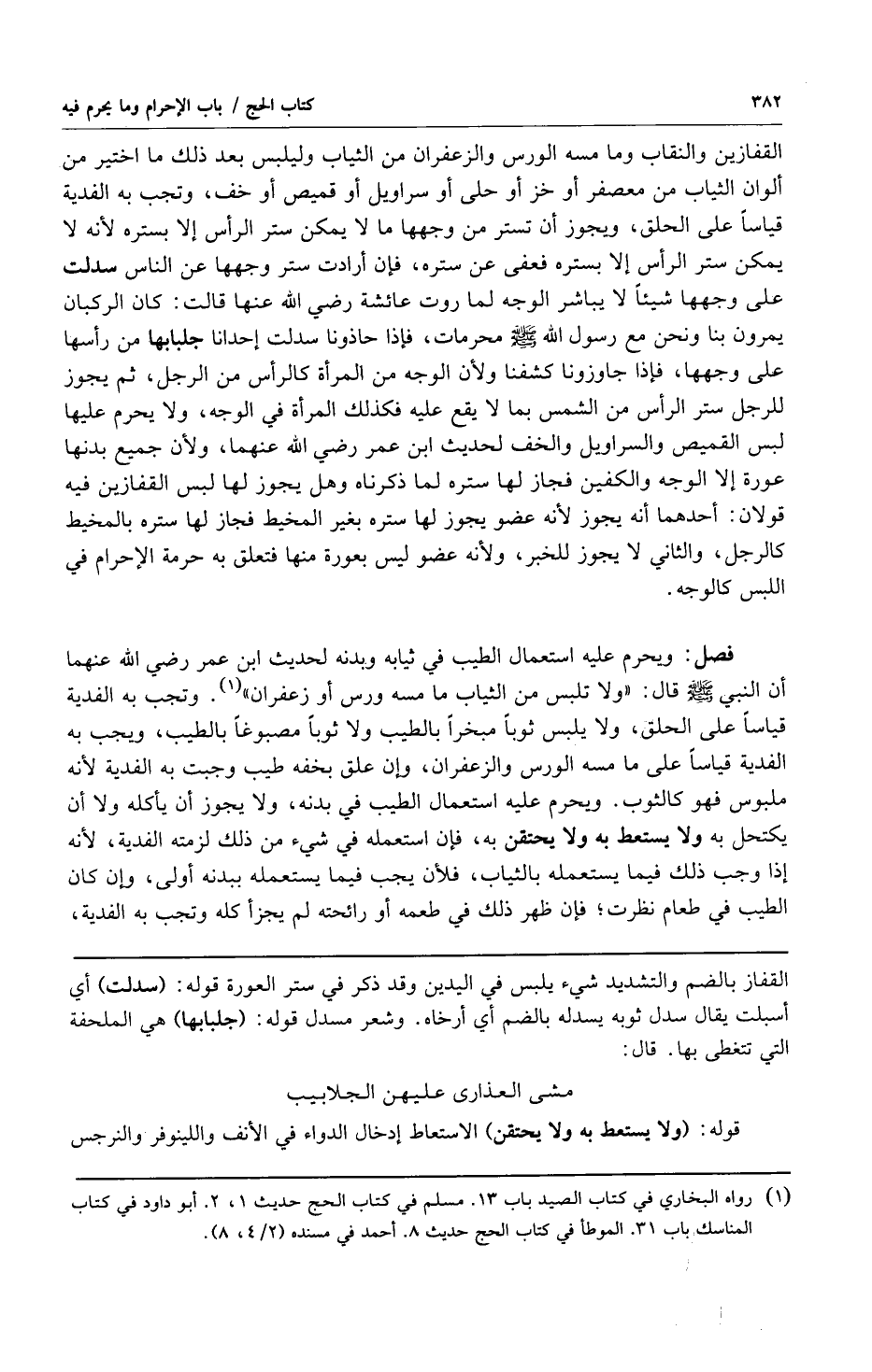 فصل: ويحرم عليه استعمال الطيب في ثيابه وبدنه لحديث ابن عمر رضي الله عنهما أن النبي صلى الله عليه وسلم قال: "ولا تلبس من الثياب ما مسه ورس أو زعفران1" وتجب به الفدية قياساً على الحلق ولا يلبس ثوباً مبخراً بالطيب ولا ثوباً مصبوغاً بالطيب ويجب به الفدية قياساً على ما مسه الورس والزعفران وإن علق بخفه طيب وجبت به الفدية لأنه ملبوس فهو كالثوب ويحرم عليه استعمال الطيب في بدنه ولا يجوز أن يأكله ولا أن يكتحل به ولا يستعط به ولا يحتقن به فإن استعمله في شيء من ذلك لزمته الفدية لأنه إذا وجب ذلك فيما يستعمله بالثياب فلأن يجب فيما يستعمله ببدنه أولى وإن كان الطيب في طعام نظرت فإن ظهر ذلك في طعمه أو رائحته لم يجزأ كله وتجب به الفدية