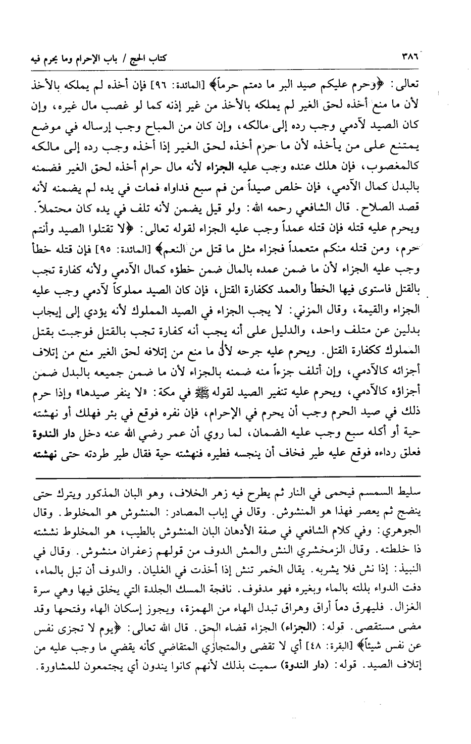 تعالى {وَحُرِّمَ عَلَيْكُمْ صَيْدُ الْبَرِّ مَا دُمْتُمْ حُرُماً} [المائدة:96] فإن أخذه لم يملكه بالأخذ لأن ما منع أخذه لحق الغير لم يملكه بالأخذ من غير إذنه كما لو غضب مال غيره وإن كان الصيد لآدمي وجب رده إلى مالكه وإن كان من المباح وجب إرساله في موضع يمتنع على من يأخذه لأن ما حرم أخذه لحق الغير إذا أخذه وجب رده إلى مالكه كالمغصوب فإن هلك عنده وجب عليه الجزاء لأنه مال حرام أخذه لحق الغير فضمنه بالبدل كمال الآدمي فإن خلص صيداً من فم سبع فداواه فمات في يده لم يضمنه لأنه قصد الصلاح قال الشافعي رحمه الله: ولو قيل يضمن لأنه تلف في يده كان محتملاً ويحرم عليه قتله فإن قتله عمداً وجب عليه الجزاء لقوله تعالى: {لا تَقْتُلُوا الصَّيْدَ وَأَنْتُمْ حُرُمٌ وَمَنْ قَتَلَهُ مِنْكُمْ مُتَعَمِّداً فَجَزَاءٌ مِثْلُ مَا قَتَلَ مِنَ النَّعَمِ} [المائدة:95] فإن قتله خطأ وجب عليه الجزاء لأن ما ضمن عمده بالمال ضمن خطؤه كمال الآدمي ولأنه كفارة تجب بالقتل فاستوى فيها الخطأ والعمد ككفارة القتل فإن كان الصيد مملوكاً لآدمي وجب عليه الجزاء والقيمة وقال المزني: لا يجب الجزاء في الصيد المملوك لأنه يؤدي إلى إيجاب بدلين عن متلف واحد والدليل على أنه يجب أنه كفارة تجب بالقتل فوجبت بقتل المملوك ككفارة القتل ويحرم عليه جرحه لأن ما منع من إتلافه لحق الغير منع من إتلاف أجزائه كالآدمي وإن أتلف جزءاً منه ضمنه بالجزاء لأن ما ضمن جميعه بالبدل ضمن أجزاؤه كالآدمي ويحرم عليه تنفير الصيد لقوله صلى الله عليه وسلم في مكة: "لا ينفر صيدها" وإذا حرم ذلك في صيد الحرم وجب أن يحرم في الإحرام فإن نفره فوقع في بئر فهلك أو نهشته حية أو أكله سبع وجب عليه الضمان لما روي أن عمر رضي الله عنه دخل دار الندوة فعلق رداءه فوقع عليه طير فخاف أن ينجسه فطيره فنهشته حية فقال طير طردته حتى نهشته