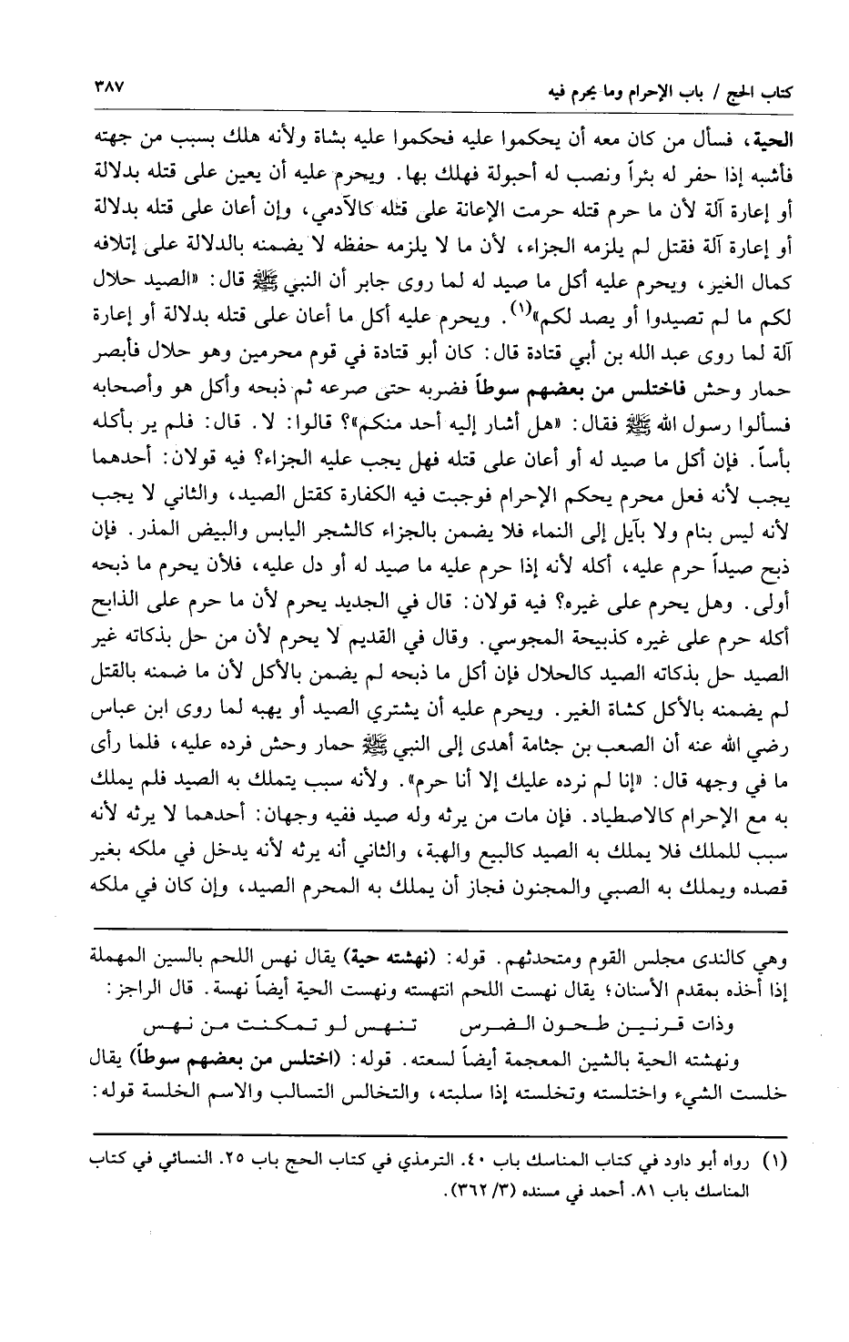 الحية فسأل من كان معه أن يحكموا عليه فحكموا عليه بشاة ولأنه هلك بسبب من جهته فأشبه إذا حفر له بئراً ونصب له أحبولة فهلك بها ويحرم عليه أن يعين على قتله بدلالة أو إعارة آلة لأن ما حرم قتله حرمت الإعانة على قتله كالآدمي وإن أعان على قتله بدلالة أو إعارة آلة فقتل لم يلزمه الجزاء لأن ما لا يلزمه حفظه لا يضمنه بالدلالة على إتلافه كمال الغير ويحرم عليه أكل ما صيد له لما روى جابر أن النبي صلى الله عليه وسلم قال: "الصيد حلال لكم ما لم تصيدوا أو يصد لكم1" ويحرم عليه أكل ما أعان على قتله بدلالة أو إعارة آلة لما روى عبد الله بن أبي قتادة قال: كان أبو قتادة في قوم محرمين وهو حلال فأبصر حمار وحش فاختلس من بعضهم سوطاً فضربه حتى صرعه ثم ذبحه وأكل هو وأصحابه فسألوا رسول الله صلى الله عليه وسلم فقال: "هل أشار إليه أحد منكم"؟ قالوا: لا قال: فلم ير بأكله بأساً فإن أكل ما صيد له أو أعان على قتله فهل يجب عليه الجزاء؟ فيه قولان: أحدها يجب لأنه فعل محرم يحكم الإحرام فوجبت فيه الكفارة كقتل الصيد والثاني لا يجب لأنه ليس بنام ولا بآيل إلى النماء فلا يضمن بالجزاء كالشجر اليابس والبيض المذر فإن ذبح صيداً حرم عليه أكله لأنه إذا حرم عليه ما صيد له أو دل عليه فلأن يحرم ما ذبحه أولى وهل يحرم على غيره؟ فيه قولان: قال في الجديد يحرم لأن ما حرم على الذابح أكله حرم على غيره كذبيحة المجوسي وقال في القديم لا يحرم لأن من حل بذكاته غير الصيد حل بذكاته الصيد كالحلال فإن أكل ما ذبحه لم يضمن بالأكل لأن ما ضمنه بالقتل لم يضمنه بالأكل كشاة الغير ويحرم عليه أن يشتري الصيد أو يهبه لما روى ابن عباس رضي الله عنه أن الصعب بن جثامة أهدى إلى النبي صلى الله عليه وسلم حمار وحش فرده عليه فلما رأى ما في وجهه قال: "إنا لم نرده عليك إلا أنا حرم" ولأنه سبب يتملك به الصيد فلم يتملك به مع الإحرام كالاصطياد فإن مات من يرثه وله صيد ففيه وجهان: أحدهما لا يرثه لأنه سبب للملك فلا يملك به الصيد كالبيع والهبة والثاني أنه يرثه لأنه يدخل في ملكه بغير قصده ويملك به الصبي والمجنون فجاز أن يملك به المحرم الصيد وإن كان في ملكه