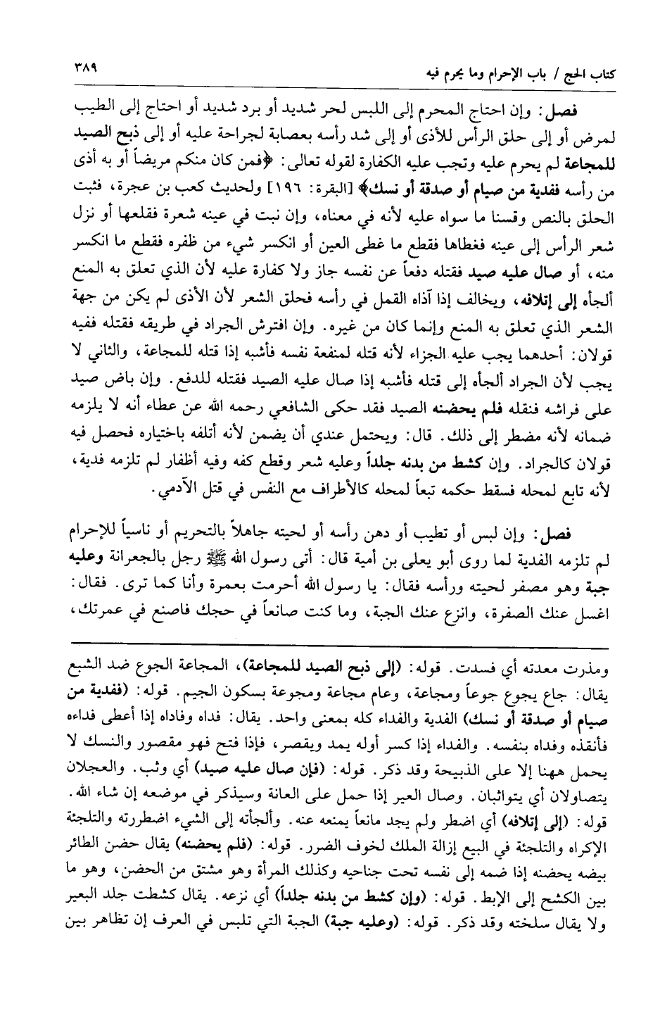 فصل: وإن احتاج المحرم إلى اللبس لحر شديد أو برد شديد أو احتاج إلى الطيب لمرض أو إلى حلق الرأس للأذى أو إلى شد رأسه بعصابة لجراحة عليه أو إلى ذبح الصيد للمجاعة لم يحرم عليه وتجب عليه الكفارة لقوله تعالى: {فَمَنْ كَانَ مِنْكُمْ مَرِيضاً أَوْ بِهِ أَذىً مِنْ رَأْسِهِ فَفِدْيَةٌ مِنْ صِيَامٍ أَوْ صَدَقَةٍ أَوْ نُسُكٍ} [البقرة:196] ولحديث كعب بن عجرة فثبت الحلق بالنص وقسنا ما سواه عليه لأنه في معناه وإن نبت في عينه شعرة فقلعها أو نزل شعر الرأس إلى عينه فغطاها فقطع ما غطى العين أو انكسر شيء من ظفره فقطع ما انكسر منه أو صال عليه صيد فقتله دفعاً عن نفسه جاز ولا كفارة عليه لأن الذي تعلق به المنع ألجأه إلى إتلافه ويخالف إذا آذاه القمل في رأسه فحلق الشعر لأن الأذى لم يكن من جهة الشعر الذي تعلق به المنع وإنما كان من غيره وإن افترش الجراد في طريقه فقتله ففيه قولان: أحدهما يجب عليه الجزاء لأنه قتله لمنفعة نفسه فأشبه إذا قتله للمجاعة والثاني لا يجب لأن الجراد ألجأه إلى قتله فأشبه إذا صال عليه الصيد فقتله للدفع وإن باض صيد على فراشه فنقله فلم يحضنه الصيد فقد حكى الشافعي رحمه الله عن عطاء أنه لا يلزمه ضمانه لأنه مضطر إلى ذلك قال: ويحتمل عندي أن يضمن لأنه أتلفه باختياره فحصل فيه قولان كالجراد وإن كشط من بدنه جلداً وعليه شعر وقطع كفه وفيه أظافر لم تلزمه فدية لأنه تابع لمحله فسقط حكمه تبعاً لمحله كالأطراف مع النفس في قتل الآدمي.