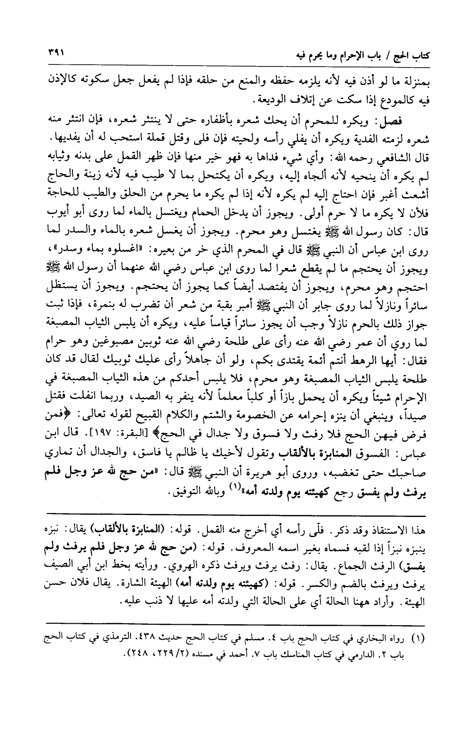 فصل: ويكره للمحرم أن يحك شعره بأظافره حتى لا ينتثر شعره فإن انتثر منه شعره لزمته الفدية ويكره أن يفلي رأسه ولحيته فإن فلى وقتل قملة استحب له أن يفديها قال الشافعي رحمه الله: وأي شيء فداها به فهو خير منها فإن ظهر القمل على بدنه وثيابه لم يكره أن ينحيه لأنه ألجأه إليه ويكره أن يكتحل بما لا طيب فيه لأنه زينة والحاج أشعث أغبر فإن احتاج إليه لم يكره لأنه إذا لم يكره ما يحرم من الحلق والطيب للحاجة فلأن لا يكره ما لا حرم أولى ويجوز أن يدخل الحمام ويغتسل بالماء لما روى أبو أيوب قال: كان رسول الله صلى الله عليه وسلم يغتسل وهو محرم ويجوز أن يغسل شعره بالماء والسدر لما روى ابن عباس أن النبي صلى الله عليه وسلم قال في المحرم الذي خر من بعيره: "اغسلوا بماء وسدر" ويجوز أن يحتجم ما لم يقطع شعرا لما روى ابن عباس رضي الله عنهما أن رسول الله صلى الله عليه وسلم احتجم وهو محرم ويجوز أن يفتصد أيضاً كما يجوز أن يحتجم ويجوز أن يستظل سائراً ونازلاً لما روى جابر أن النبي صلى الله عليه وسلم أمر بقبة من شعر أن تضرب له بنمرة فإذا ثبت جواز ذلك بالحرم نازلاً وجب أن يجوز سائراً قياساً عليه ويكره أن يلبس الثياب المصبغة لما روي أن عمر رضي الله عنه رأى على طلحة رضي الله عنه ثوبين مصبوغين وهو حرام فقال: أيها الرهط أنتم أئمة يقتدى بكم ولو أن جاهلاً رأى عليك ثوبيك لقال قد كان طلحة يلبس الثياب المصبغة وهو محرم فلا يلبس أحدكم من هذه الثياب المصبغة في الإحرام شيئاً ويكره أن يحمل بازاً أو كلباً معلماً لأنه ينفر به الصيد وربما انفلت فقتل صيداً وينبغي أن ينزه إحرامه عن الخصومة والشتم والكلام القبيح لقوله تعالى: {فَمَنْ فَرَضَ فِيهِنَّ الْحَجَّ فَلا رَفَثَ وَلا فُسُوقَ وَلا جِدَالَ فِي الْحَجِّ} [البقرة:197] قال ابن عباس: الفسوق المنابزة بالألقاب وتقول لأخيك يا ظالم يا فاسق والجدال أن تماري صاحبك حتى تغضبه وروى أبو هريرة أن النبي صلى الله عليه وسلم قال: "من حج لله عز وجل فلم يرفث ولم يفسق رجع كهيئته يوم ولدته أمه1" وبالله التوفيق.
