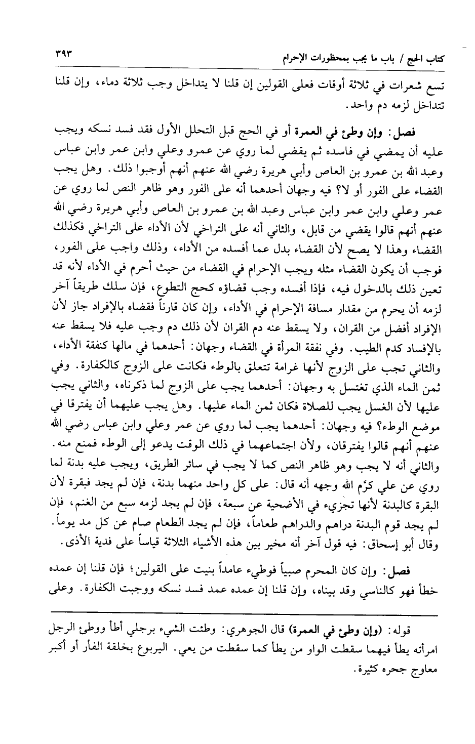 فصل: وإن وطئ في العمرة أو في الحج قبل التحلل الأول فقد فسد نسكه ويجب عليه أن يمضي في فاسده ثم يقضي لما روي عن عمرو وعلي وابن عمر وابن عباس وعبد الله بن عمرو بن العاص وأبي هريرة رضي الله عنهم أنهم أوجبوا ذلك وهل يجب القضاء على الفور أو لا؟ فيه وجهان أحدهما أنه على الفور وهو ظاهر النص لما روي عن عمر وعلي وابن عمر وابن عباس وعبد الله بن عمرو بن العاص وأبي هريرة رضي الله عنهم أنهم قالوا يقضي من قابل والثاني أنه على التراخي لأن الأداء على التراخي فكذلك القضاء وهذا لا يصح لأن القضاء بدل عما أفسده من الأداء وذلك واجب على الفور فوجب أن يكون القضاء مثله ويجب الإحرام في القضاء من حيث أحرم في الأداء لأنه قد تعين ذلك بالدخول فيه فإذا أفسده وجب قضاؤه كحج التطوع فإن سلك طريقاً آخر لزمه أن يحرم من مقدار مسافة الإحرام في الأداء وإن كان قارناً فقضاه بالإفراد جاز لأن الإفراد أفضل من القران ولا يسقط عنه دم القران لأن ذلك دم وجب عليه فلا يسقط عنه بالإفساد كدم الطيب وفي نفقة المرأة في القضاء وجهان: أحدهما في مالها كنفقة الأداء والثاني تجب على الزوج لأنها غرامة تتعلق بالوطء فكانت على الزوج كالكفارة وفي ثمن الماء الذي تغتسل به وجهان: أحدهما يجب على الزوج لما ذكرناه والثاني يجب عليها لأن الغسل يجب للصلاة فكان ثمن الماء عليها وهل يجب عليهما أن يفترقا في موضع الوطء؟ فيه وجهان: أحدهما يجب لما روي عن عمر وعلي وابن عباس رضي الله عنهم أنهم قالوا يفترقان ولأن اجتماعهما في ذلك الوقت يدعو إلى الوطء فمنع منه والثاني أنه لا يجب وهو الظاهر النص كما لا يجب في سائر الطريق ويجب عليه بدنة روي عن علي كرم الله وجهه أنه قال: على كل واحد منهما بدنة فإن لم يجد فبقرة لأن البقرة كالبدنة لأنها تجزئ في الأضحية عن سبعة فإن لم يجد لزمه سبع من الغنم فإن لم يجد قوم البدنة دراهم والدراهم طعاماً فإن لم يجد الطعام صام عن كل مد يوماً وقال أبو إسحاق: فيه قول آخر أنه مخير بين هذه الأشياء الثلاثة قياساً على فدية الأذى.