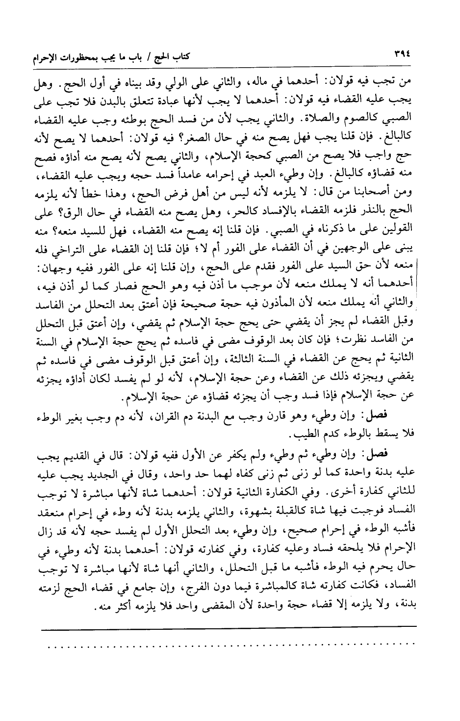 من تجب فيه قولان: أحدهما في ماله والثاني على الولي وقد بيناه في أول الحج وهل يجب عليه القضاء فيه قولان: أحدهما لا يجب لأنها عبادة تتعلق بالبدن فلا تجب على الصبي كالصوم والصلاة والثاني يجب لأن من فسد الحج بوطئه وجب عليه القضاء كالبالغ فإن قلنا يجب فهل يصح منه في حال الصغر؟ فيه قولان: أحدهما لا يصح لأنه حج واجب فلا يصح من الصبي كحجة الإسلام والثاني يصح لأنه يصح منه أداؤه فصح منه قضاؤه كالبالغ وإن وطئ العبد في إحرامه عامداً فسد حجه ويجب عليه القضاء ومن أصحابنا من قال: لا يلزمه لأنه ليس من أهل فرض الحج وهذا خطأ لأنه يلزمه الحج بالنذر فلزمه القضاء بالإفساد كالحر وهل يصح منه القضاء في حال الرق؟ على القولين على ما ذكرناه في الصبي فإن قلنا إنه يصح منه القضاء فهل للسيد منعه؟ منه يبنى على الوجهين في أن القضاء على الفور أم لا فإن قلنا إن القضاء على التراخي فله منعه لأن حق السيد على الفور فقدم على الحج وإن قلنا على الفور ففيه وجهان: أحدهما أنه لا يملك منعه لأن موجب ما أذن فيه وهو الحج فصار كما لو أذن فيه والثاني أنه يملك منعه لأن المأذون فيه حجة صحيحية فإن أعتق بعد التحلل من الفاسد وقبل القضاء لم يجز أن يقضي حتى يحج الإسلام ثم يقضي وإن أعتق قبل التحلل من الفاسد نظرت فإن كان بعد الوقوف مضى في فاسده ثم يحج حجة الإسلام في السنة الثانية ثم يحج عن القضاء في السنة الثالثة وإن أعتق قبل الوقوف مضى في فاسده ثم يقضي ويجزئه ذلك عن القضاء وعن حجة الإسلام لأنه لو لم يفسد لكان أداؤه يجزئه عن حجة الإسلام فإذا فسد وجب أن يجزئه قضاؤه عن حجة الإسلام.