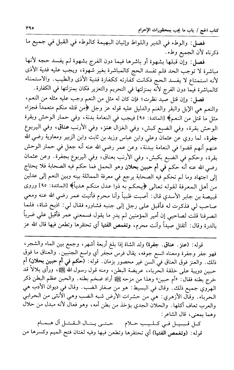 فصل: وإن قتل صيد نظرت فإن كان له مثل من النعم وجب عليه مثله من النعم والنعم هي الإبل والبقر والغنم والدليل عليه قوله عز وجل {وَمَنْ قَتَلَهُ مِنْكُمْ مُتَعَمِّداً فَجَزَاءٌ مِثْلُ مَا قَتَلَ مِنَ النَّعَمِ} [المائدة:95] فيجب في النعامة بدنة وفي حمار الوحش وبقرة الوحش بقرة وفي الضبع كبش وفي الغزال عنز وفي الأرنب عناق وفي اليربوع جفرة لما روي عن عثمان وعلي وابن عباس وزيد بن ثابت وابن الزبير ومعاوية رضي الله عنهم أنهم قضوا في النعامة ببدنة وعن عمر رضي الله عنه أنه جعل في حمار الوحش بقرة وحكم في الضبع بكبش وفي الأرنب بعناق وفي اليربوع بجفرة وعن عثمان رضي الله عنه أنه حكم في أم حبين بحلان وهو الحمل فما حكم في الصحابة فلا يحتاج إلى اجتهاد وما لم تحكم في الصحابة يرجع في معرفة المماثلة بينه وبين النعم إلى عدلين من أهل المعرفة لقوله تعالى {يَحْكُمُ بِهِ ذَوَا عَدْلٍ مِنْكُمْ هَدْياً} [المائدة:95] وروى قبيصة بن جابر الأسدي قال: أصبت ظبياً وأنا محرم فأتيت عمر رضي الله عنه ومعي صاحب لي فذكرت له فأقبل على رجل إلى جنبه فشاوره فقال لي: اذبح شاة فلما انصرفنا قلت لصاحبي إن أمير المؤمنين لم يدر ما يقول فسمعني فأقبل علي ضرباً بالدرة وقال: أتقتل صيداً وأنت محرم وتغمص الفتيا أي تحتقرها وتطعن فيها قال الله عز