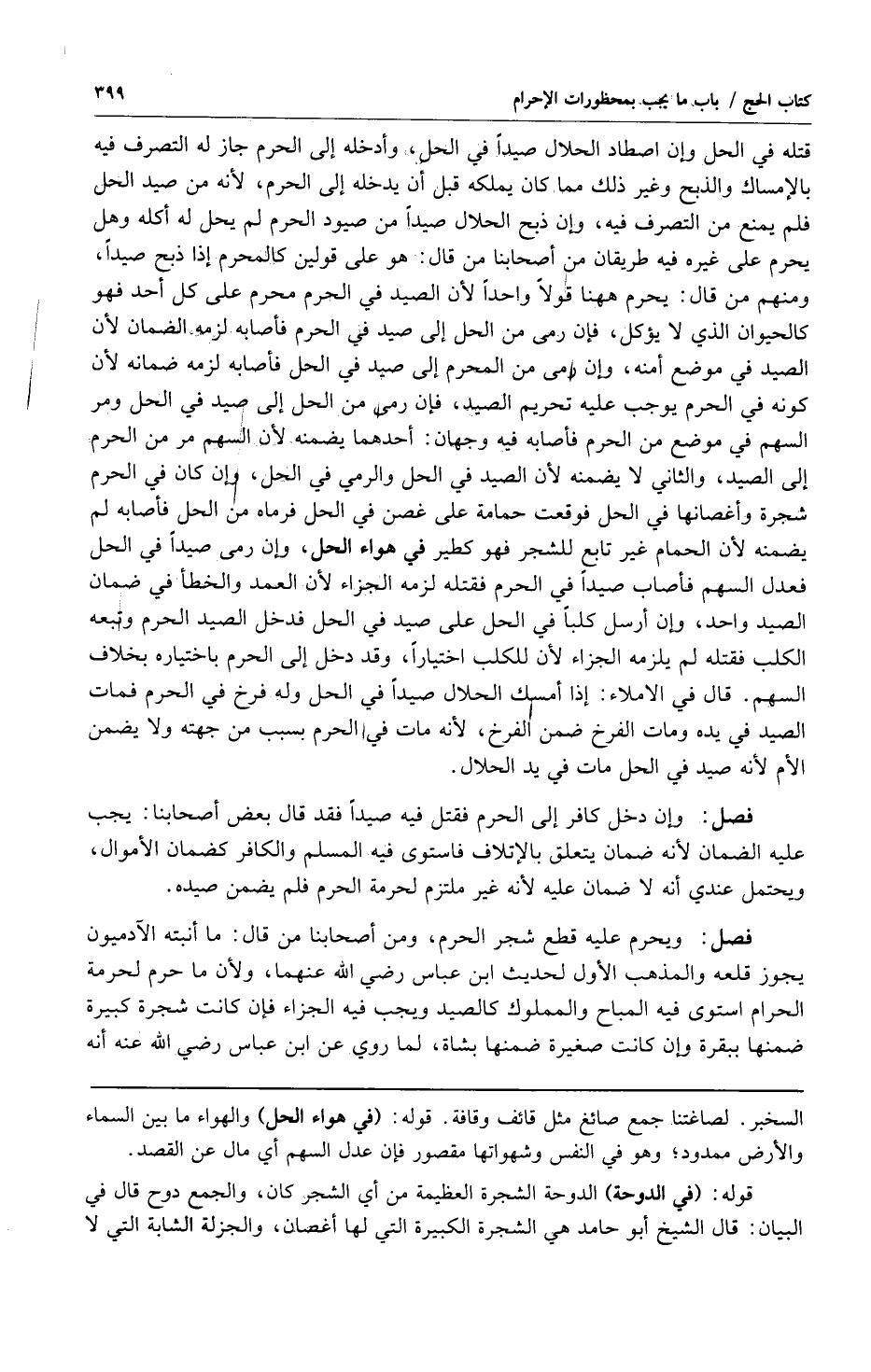 قتله في الحل وإن اصطاد الحلال صيداً في الحل وأدخله إلى الحرم جاز له التصرف فيه بالإمساك والذبح وغير ذلك مما كان يملكه قبل أن يدخله إلى الحرم لأنه من صيد الحل فلم يمنع من التصرف فيه وإن ذبح الحلال صيداً من صيود الحرم لم يحل له أكله وهل يحرم على غيره فيه طريقان من أصحابنا من قال: هو على قولين كالمحرم إذا ذبح صيداً ومنهم من قال: يحرم ههنا قولاً واحداً لأن الصيد في الحرم محرم على كل أحد فهو كالحيوان الذي لا يؤكل فإن رمى من الحل إلى صيد في الحرم فأصابه لزمه الضمان لأن الصيد في موضع أمنه وإن رمى من المحرم إلى صيد في الحل فأصابه لزمه ضمانه لأن كونه في الحرم يوجب عليه تحريم الصيد فإن رمى من الحل إلى صيد في الحل ومر السهم في موضع من الحرم فأصابه فيه وجهان: أحدهما يضمنه لأن السهم مر من الحرم إلى الصيد والثاني لا يضمنه لأن الصيد في الحل والرمي في الحل وإن كان في الحرم شجرة وأغصانها في الحل فوقعت حمامة على غصن في الحل فرماه من الحل فأصابه لم يضمنه لأن الحمام غير تابع للشجر فهو كطير في هواء الحل وإن رمى صيداً في الحل فعدل السهم فأصاب صيداً في الحرم فقتله لزمه الجزاء لأن العمد والخطأ في ضمان الصيد واحد وإن أرسل كلباً في الحل على صيد في الحل فدخل الصيد الحرم وتبعه الكلب فقتله لم يلزمه الجزاء لأن الكلب اختياراً وقد دخل إلى الحرم باختياره بخلاف السهم قال في الإملاء: إذا أمسك الحلال صيداً في الحل وله فرخ في الحرم فمات الصيد في يده ومات الفرخ لأنه مات في الحرم بسبب من جهته ولا يضمن الأم لأنه صيد في الحل مات في يد الحلال.